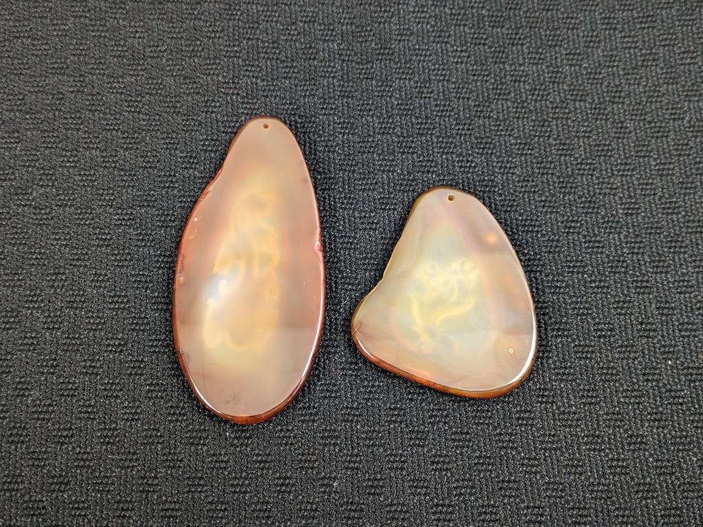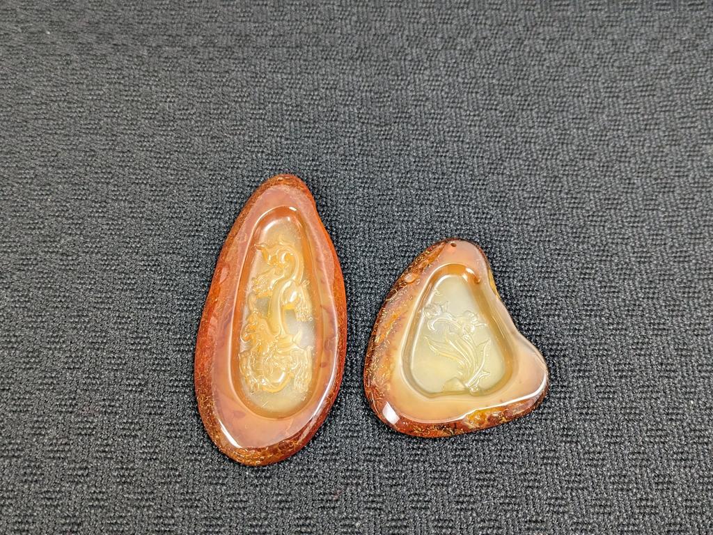 (2) Chinese carved Agate pendants. One with dragon and other with floral decoration. 4.5" & 3" long.