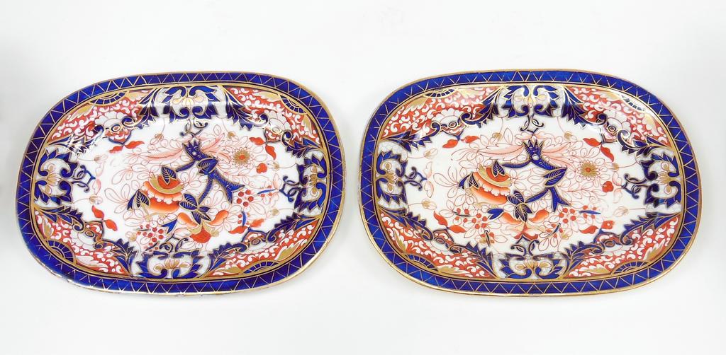 (2) Early 19th C. Royal Crown Derby covered sauce bowls with plates. Sauce bowls with 1806 - 1825 mark, plates with no mark. Missing ladles. Sauce bowl: 7" x 5".