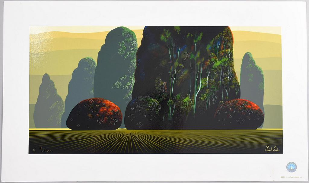 (2) Eyvind Earle serigraphs, signed. Quiet Pastures #64/160, Estate signed Autumn Eucalyptus, #E 2/200. Unframed, overall: 13.75" x 40" & 21.5" x 36".