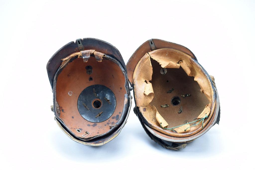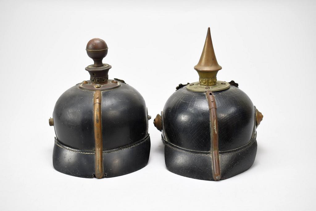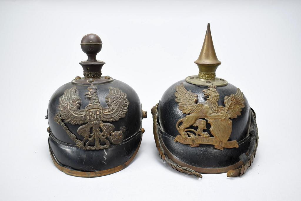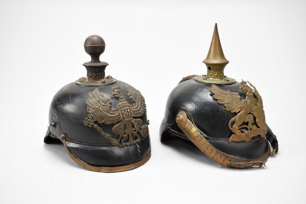 (2) German Artillery & Infantry helmets. Artillery helmet with ball finial and Prussian eagle wappen; Infantry helmet with spike finial, Grand Duke of Baden Coat of Arms.