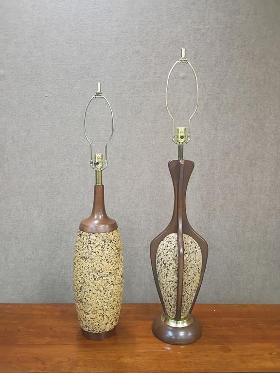 (2) Modernist teak and cork table lamps. Ovoid cork bodies with teak mounts, period shades. Overall: 43" & 38.25" tall.