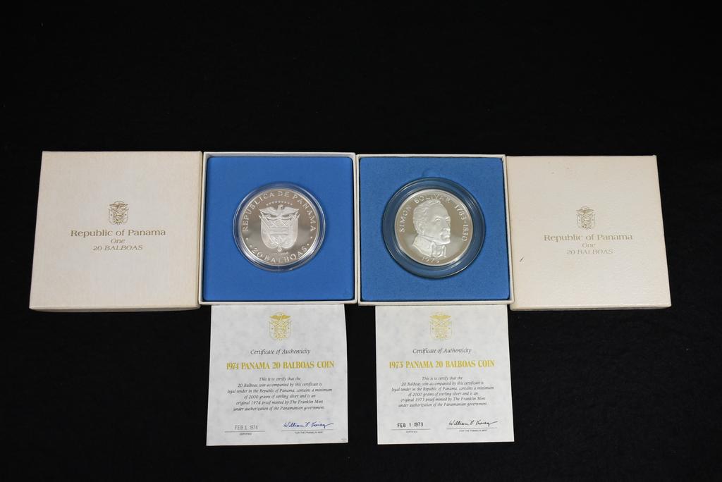 (2) Panama 20 Balboas Silver coins. 1973 & 1974 Simon Bolivar.