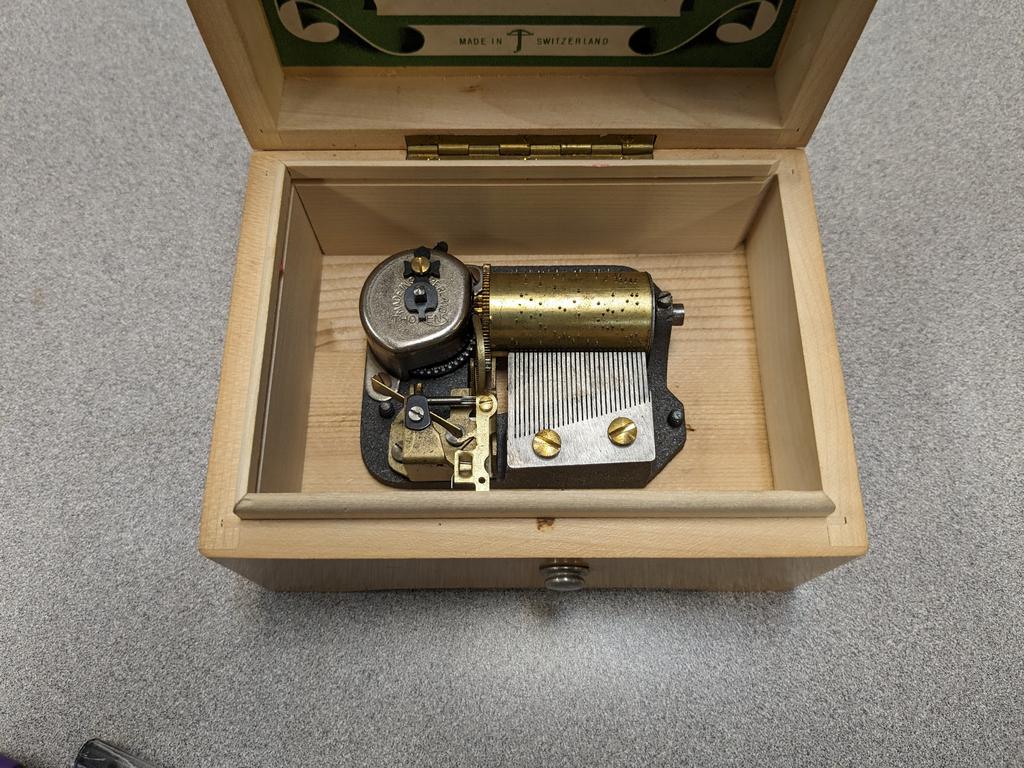 (2) Swiss music boxes, Reuge and Thorens. Reuge ch. 4.50 plays 4 Mozart tunes: Eine Kleine Nachtmusik (allegro, minuet, romance) and Don Juan (minuet); Thorens A.128 "Irish Lullaby". 8" x 4 1/2" x 3" & 4 7/8" x 3 1/2 x 2 1/2".