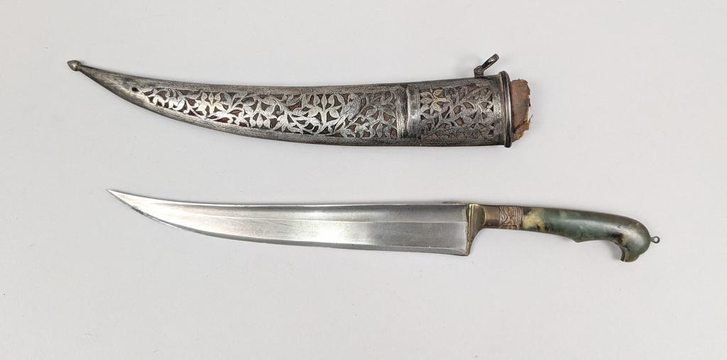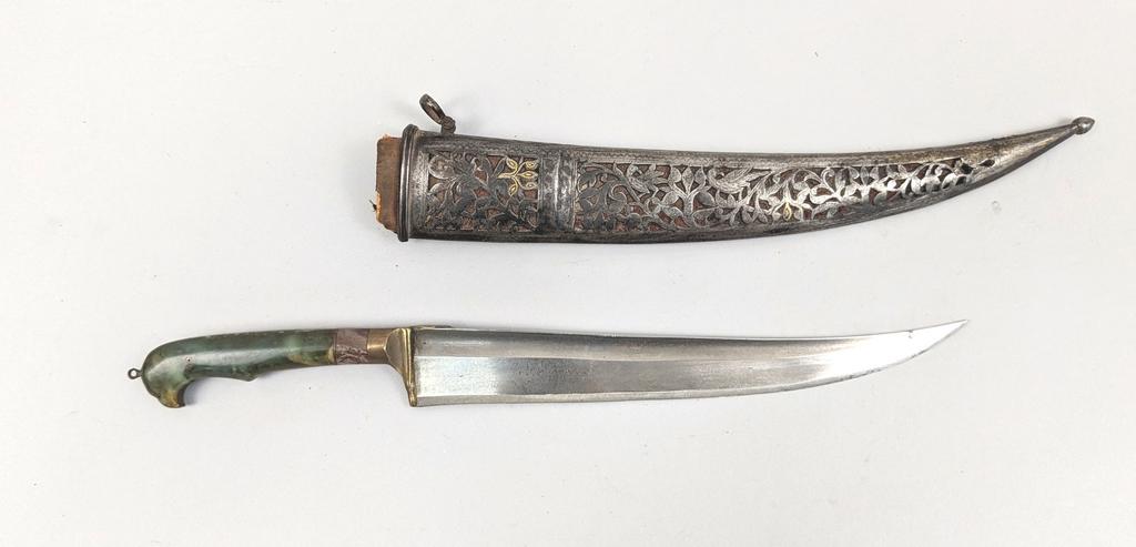 (3) 18th / 19th C. Indo-Persian Daggers and associated scabbards. 1) Gilt inlaid straight edged knife with cylindrical handle with sliver overlaid and green velvet wood scabbard. Total length 10.75 inches. Blade 6.5 inches. 2) Engraved double fullered dagger with "T" formed back and gilt metal inlaid tang. Filigree grip plaque (one missing) and filigree overlaid wood scabbard. Total length 12.5 inches. Blade 8.25 inches. 3) Fullered steel dagger with "T" formed back and brass hilt and tang. Shaped jade and hardstone grips in the form of a falcon head. Pierced steel scabbard with remnants of gilt inlay depicting birds and foliage. Total length 12 inches. Blade 8 inches.