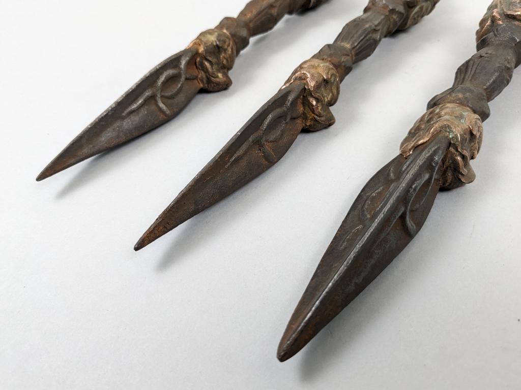 (3) 18th/19th C. Tibetan Phurba Ceremonial Daggers. Traditional form made of iron and copper. Overall length 10 inches.