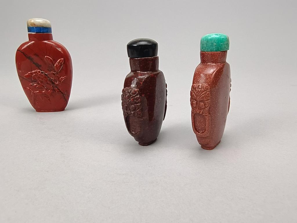 (3) Chinese hard stone carved snuff bottles. One with figure and branch, 2 with beast face sides. Bloodstone and goldstone style. All with stoppers. Tallest: 2 7/8" inches.