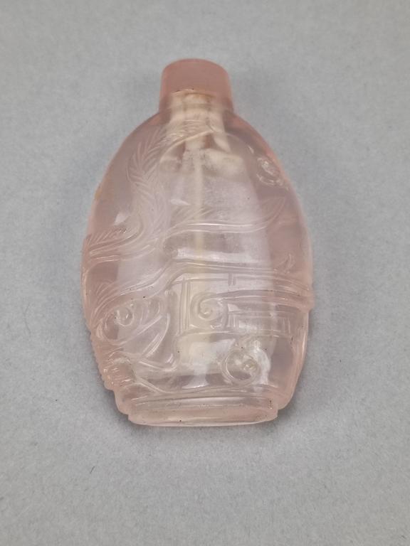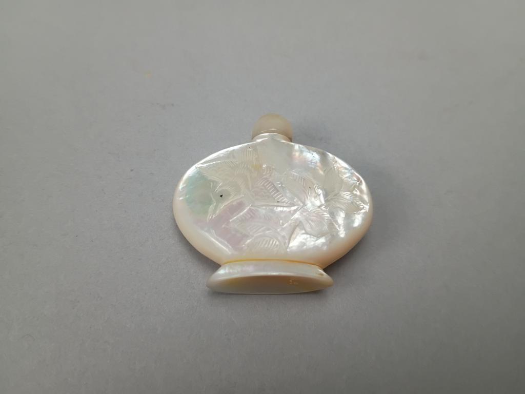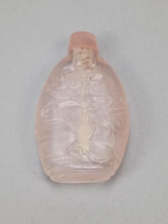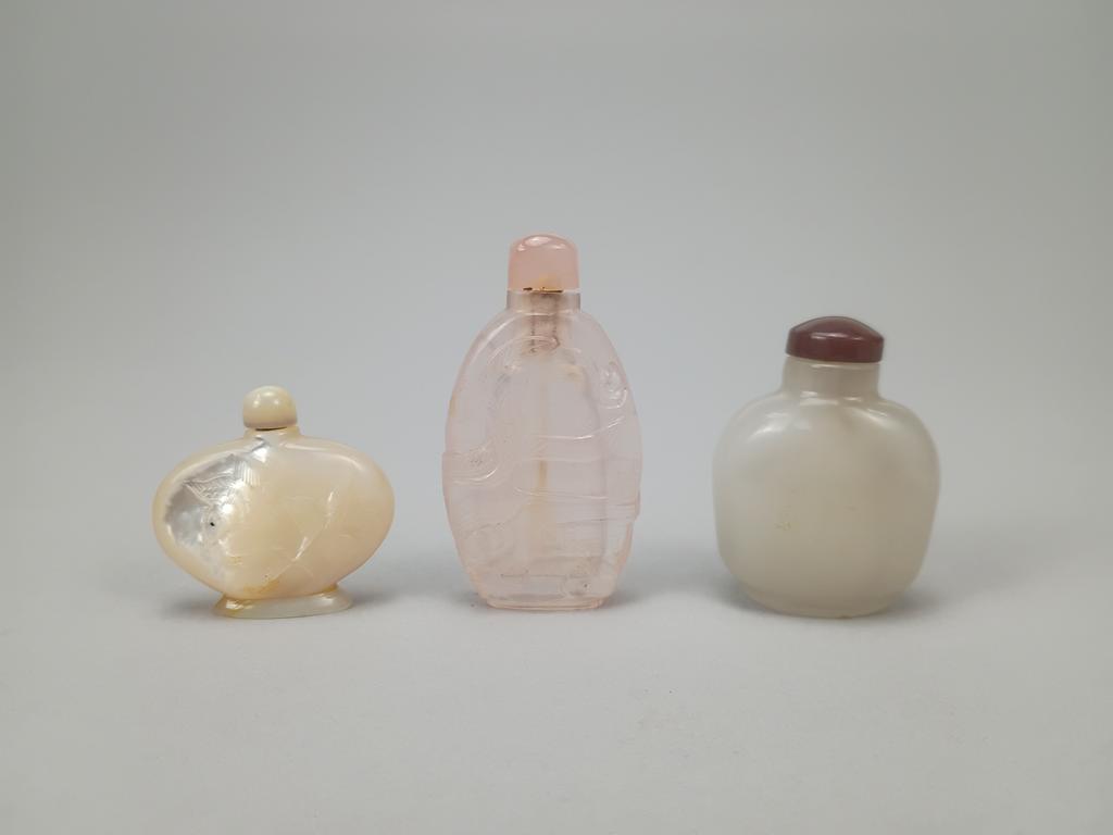 (3) Chinese snuff bottles. Jade, carved rose quartz & carved mother-of-pearl. All with stoppers. Tallest: 2 3/8" inches.