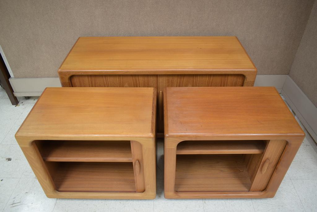 (3) Mid Century teak rolling cabinets. Dyrlund Denmark 2-door tambour front cabinet with 2 shelves. Single drawer and record rack; pair of single door tambour front cabinets. Large cabinet: 48.5" W, 20.5" D, 28.5" H.