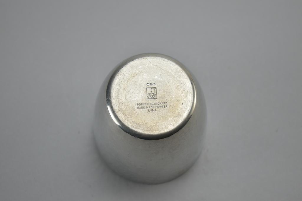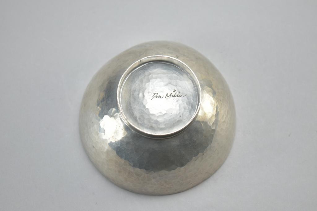 (4) Hand hammered pewter dishes. (2) Porter Blanchard Champagne coasters (Made for Gumps, 6" x 2 1/4"), Porter Blanchard mint julep cup (3 3/4") and Dan Miller bowl (4 3/4" x 2 1/4").