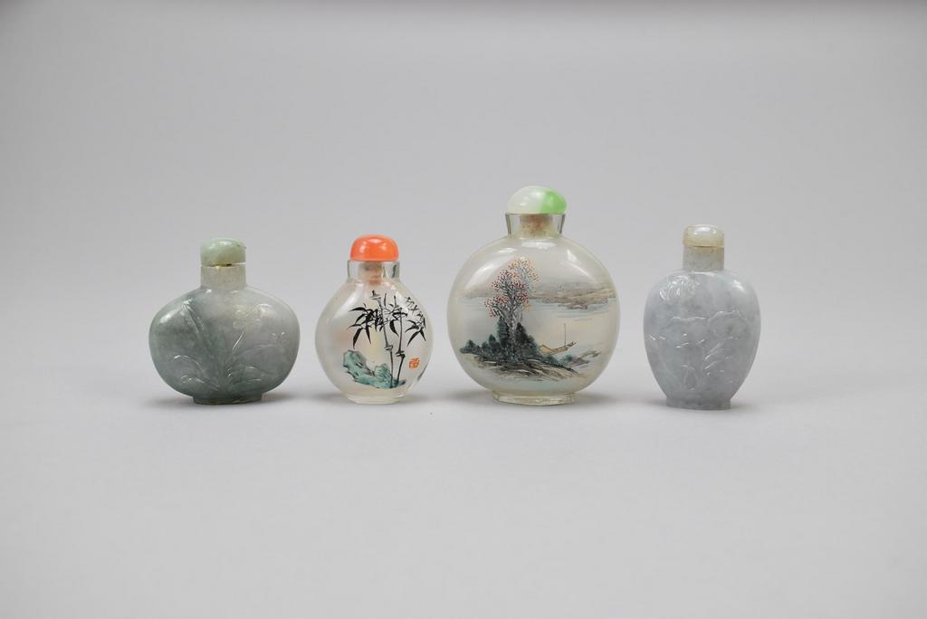 (4) Snuff bottles. (2) Floral carved jade bottles and (2) reverse painted glass snuff bottles. All with stoppers. Tallest: 3 inches.