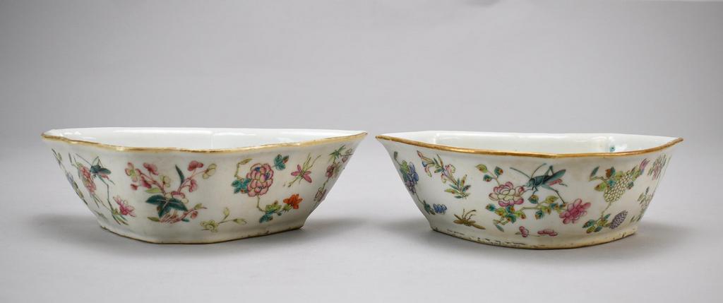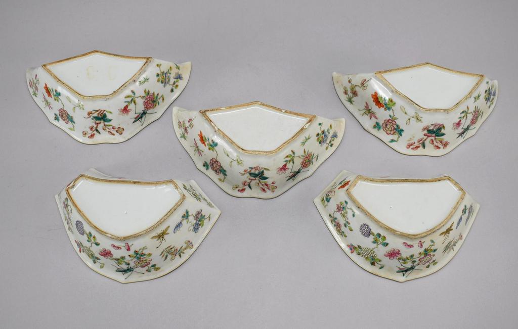 (5) Chinese famille rose porcelain dishes. Sets of (2) and (3) dishes with floral and insect decoration. 8 1/2" & 7 3/4" wide.