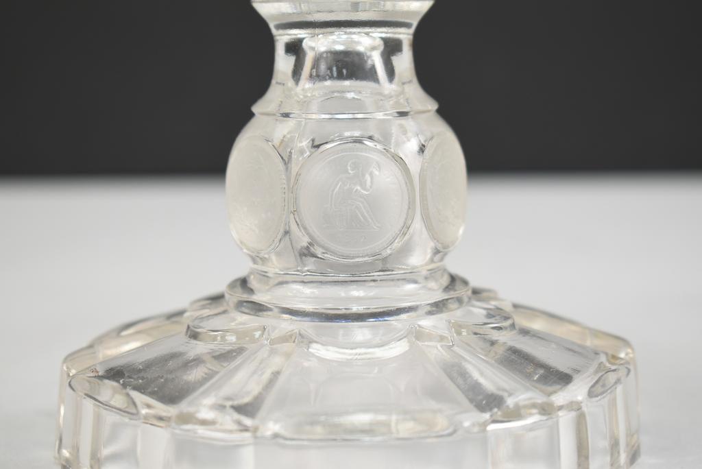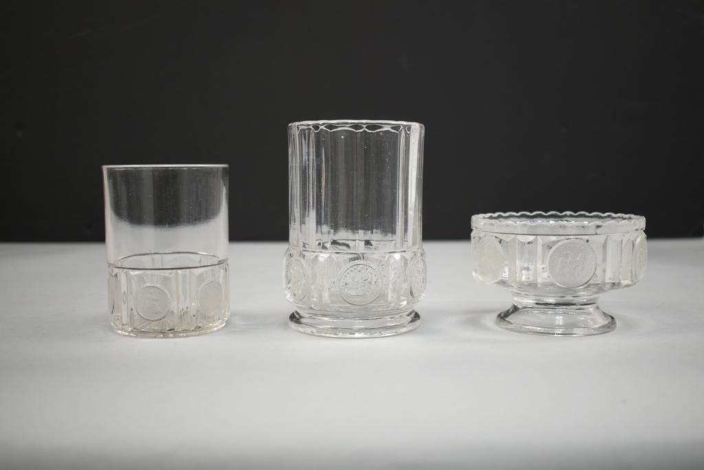 (5) Coin glass tableware items. Covered compote, open compote, glass, mug and bowl. Covered compote: 9" tall.