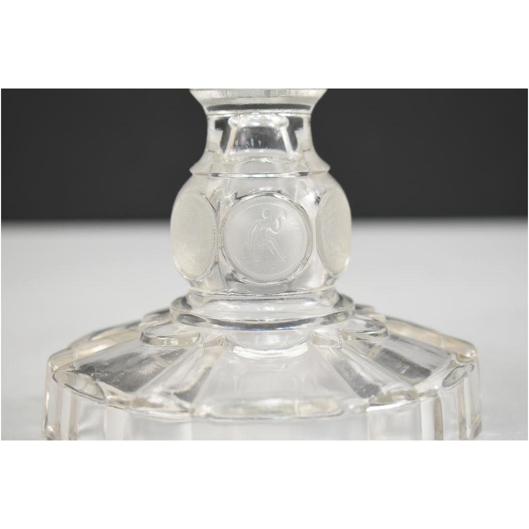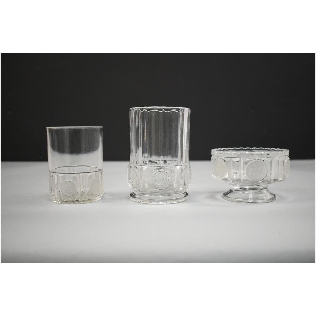 (5) Coin glass tableware items. Covered compote, open compote, glass, mug and bowl. Covered compote: 9" tall.