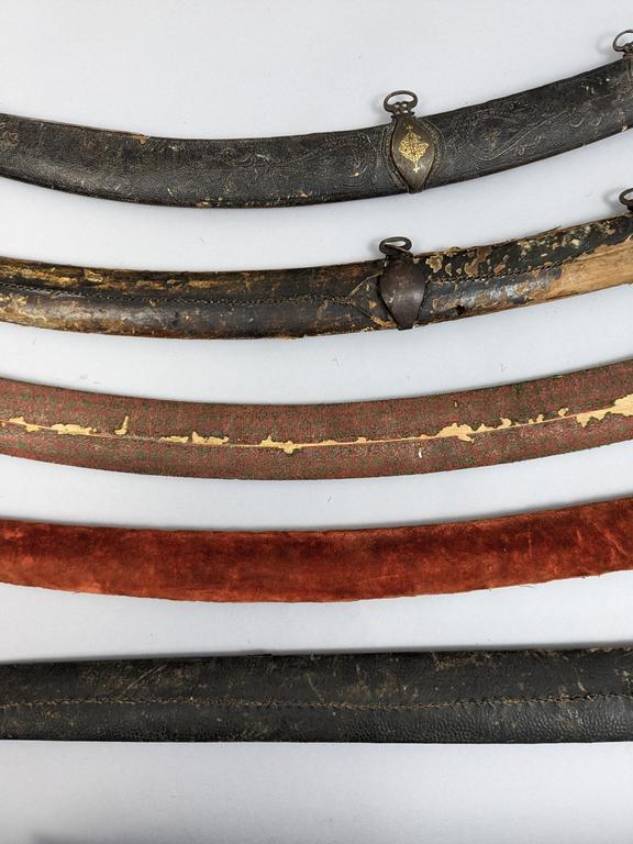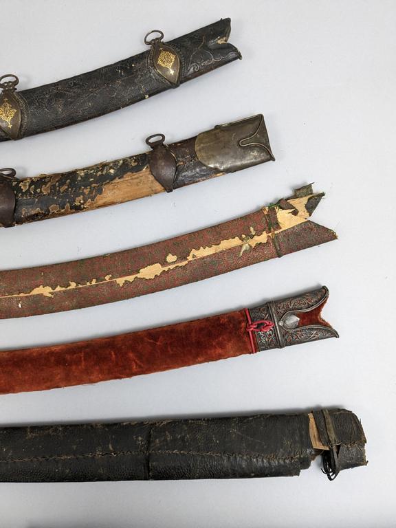 (5) Indo-Persian Pulwar / Talwar scabbards. 28" to 34" long.