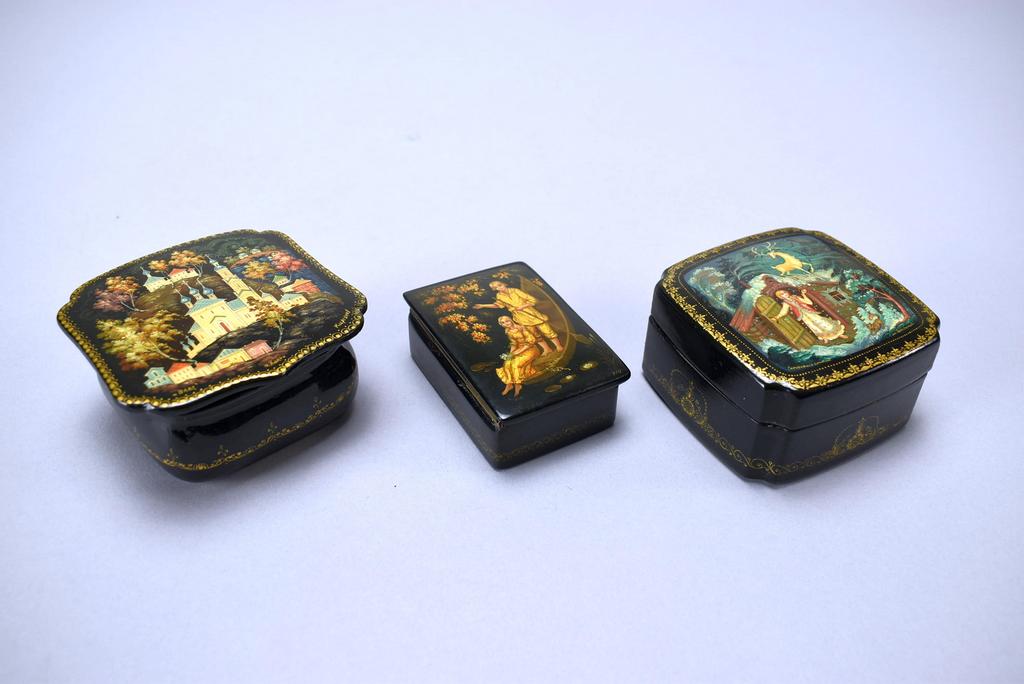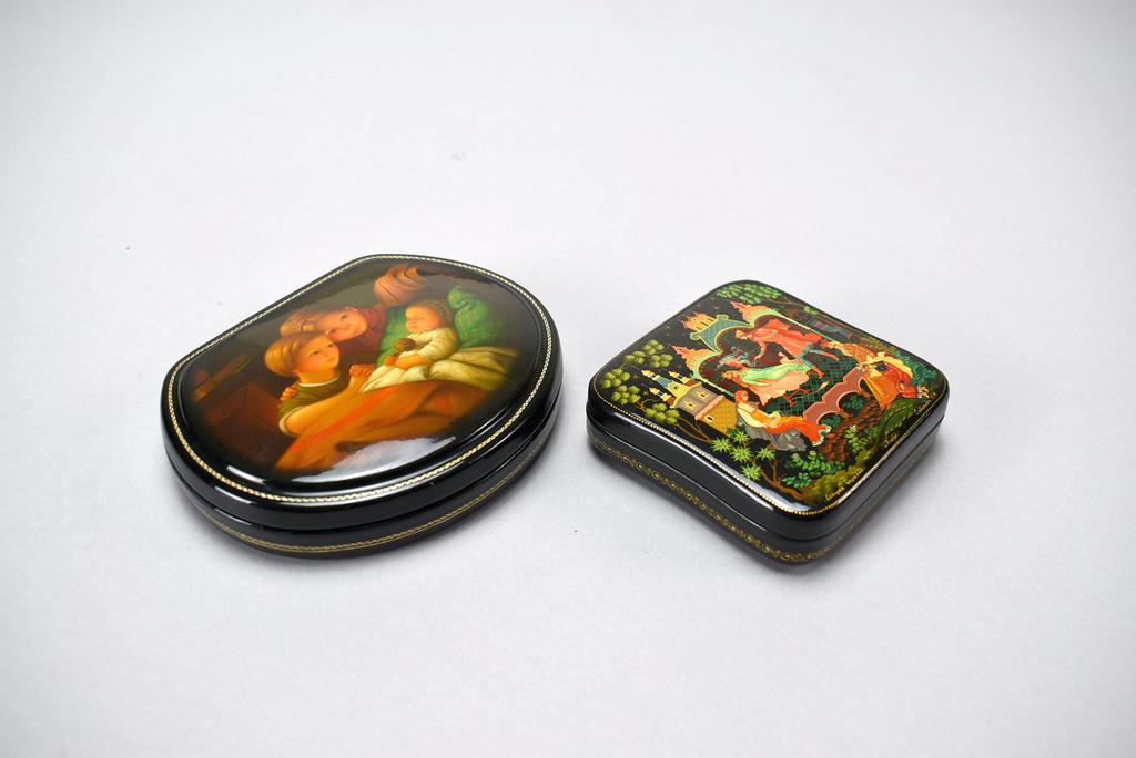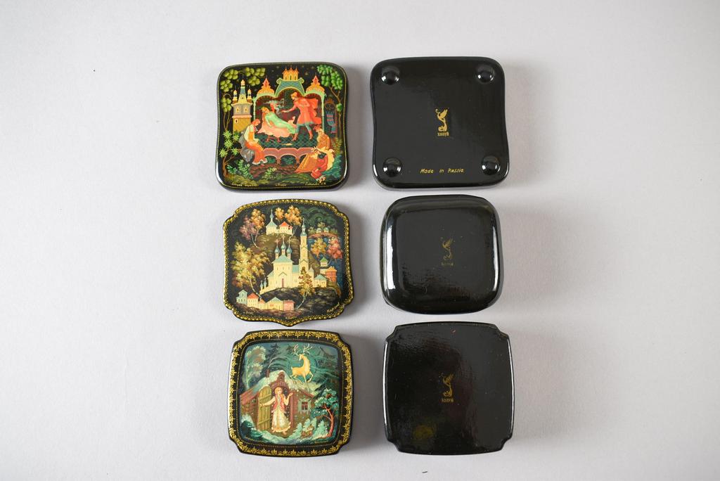 (5) Russian lacquer boxes depicting fairy tales. (2 Fedoskino & 3 Kholui). Largest: 4 1/2" x 3 5/8".
