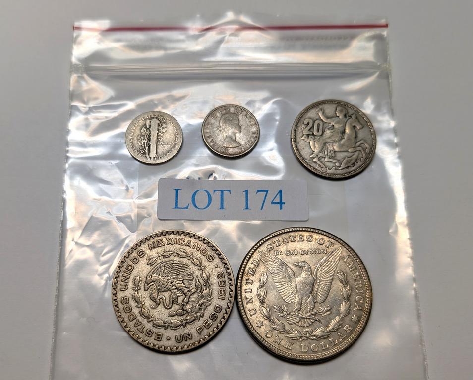 (5) Silver Coins. (1921 S Morgan, 1962 1 Peso, 1960 20 Drachmai, U.S. & Canada Dimes).