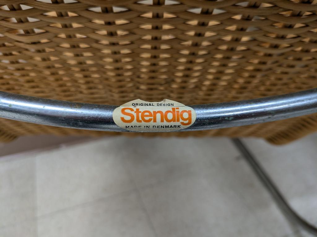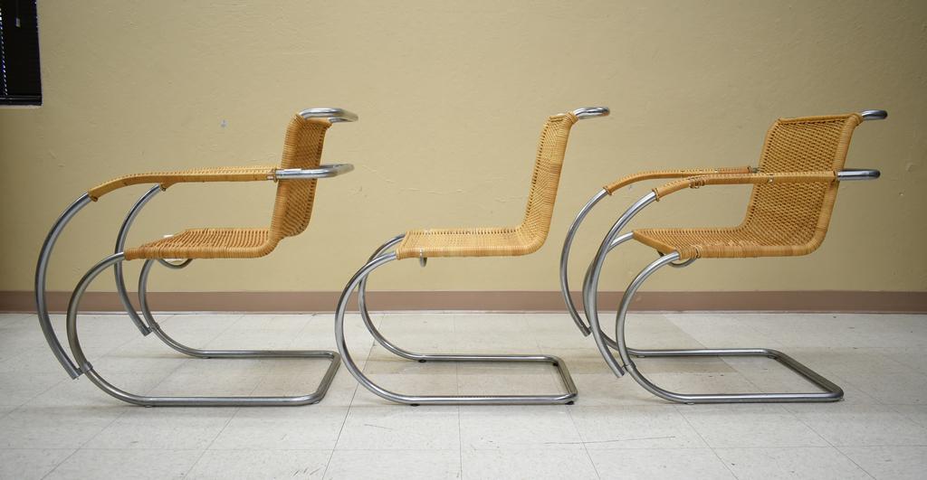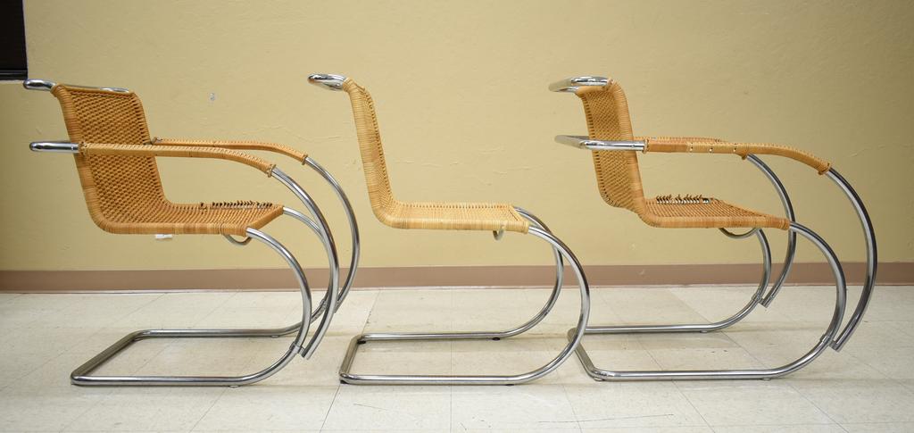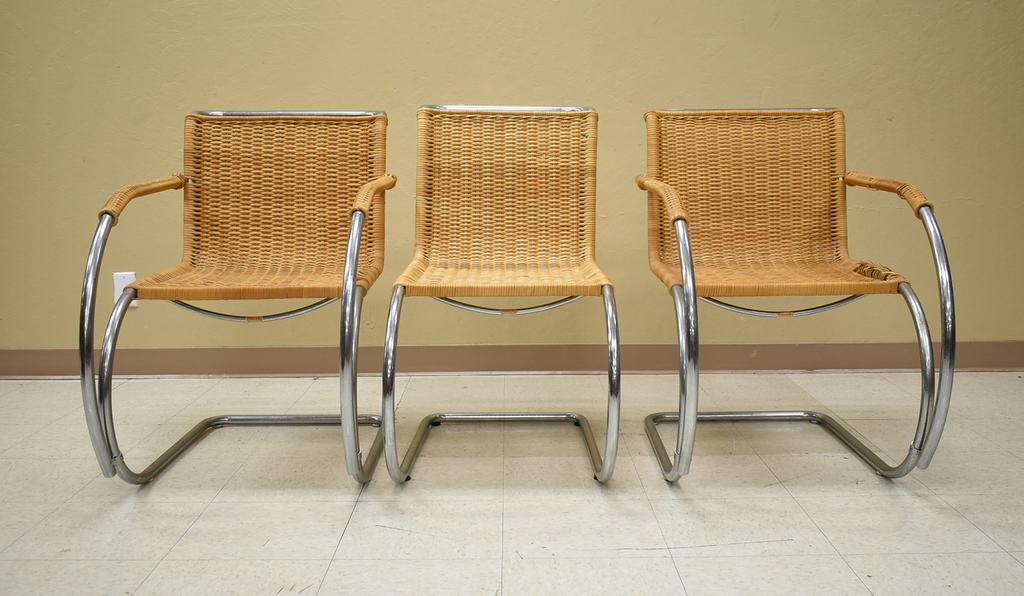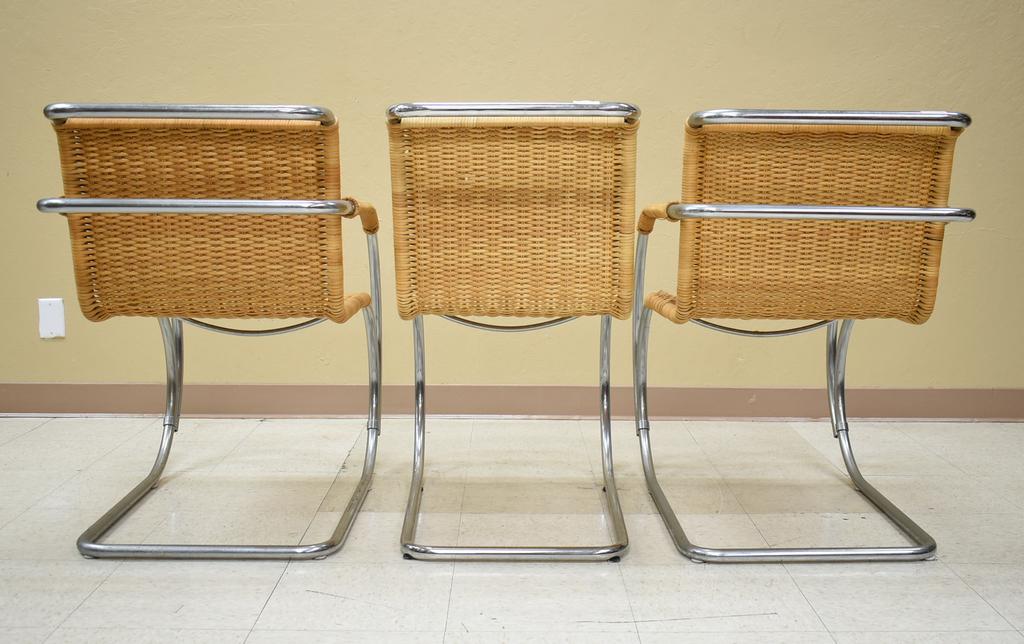 (6) Ludwig Mies van der Rohe MR chairs. Stendik Denmark. (2) Armchairs and (4) side chairs. Chrome and rattan. Armchairs: 22" W, 33" D, 33" H, side chairs: 18" W, 30" D, 33" H.