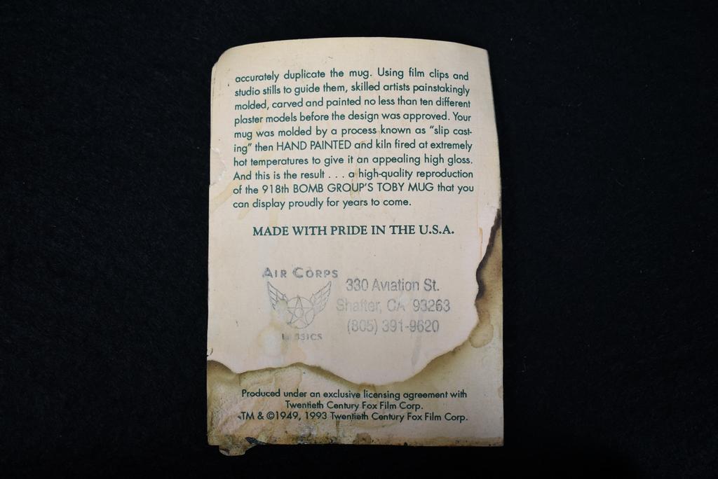 918th Bomb Group replica toby mug from the movie Twelve O'clock high. 8" tall.