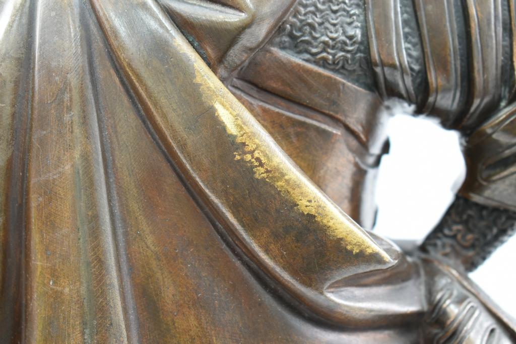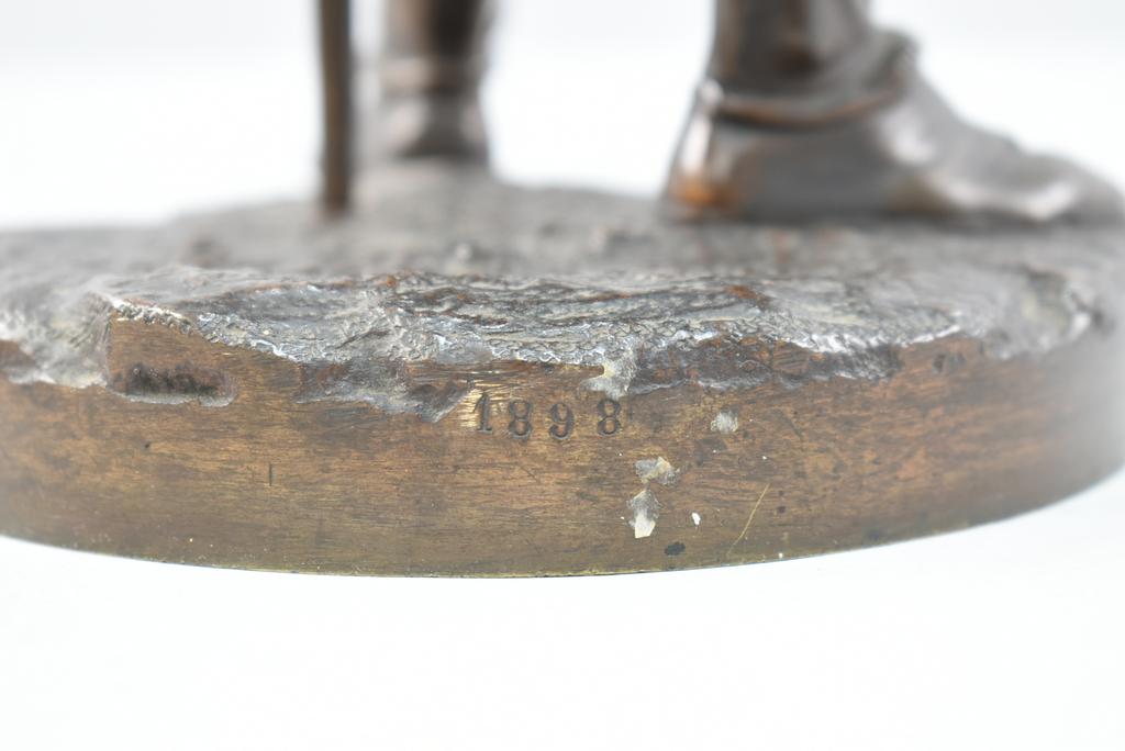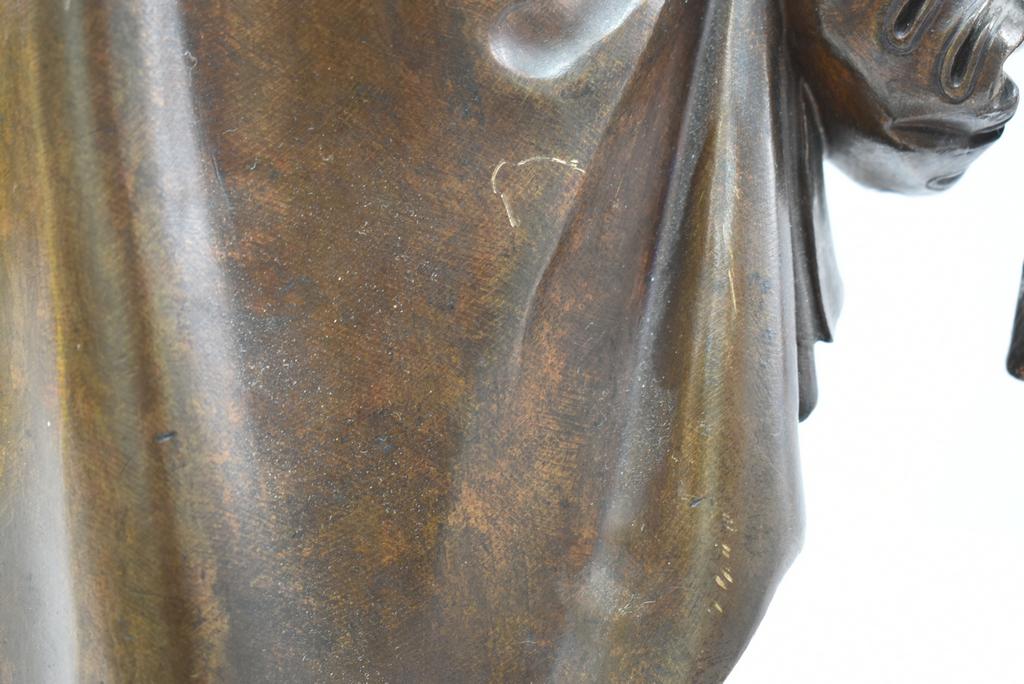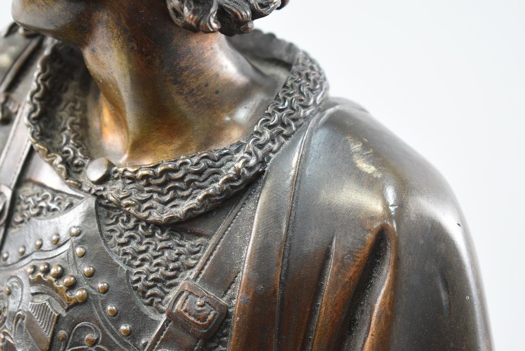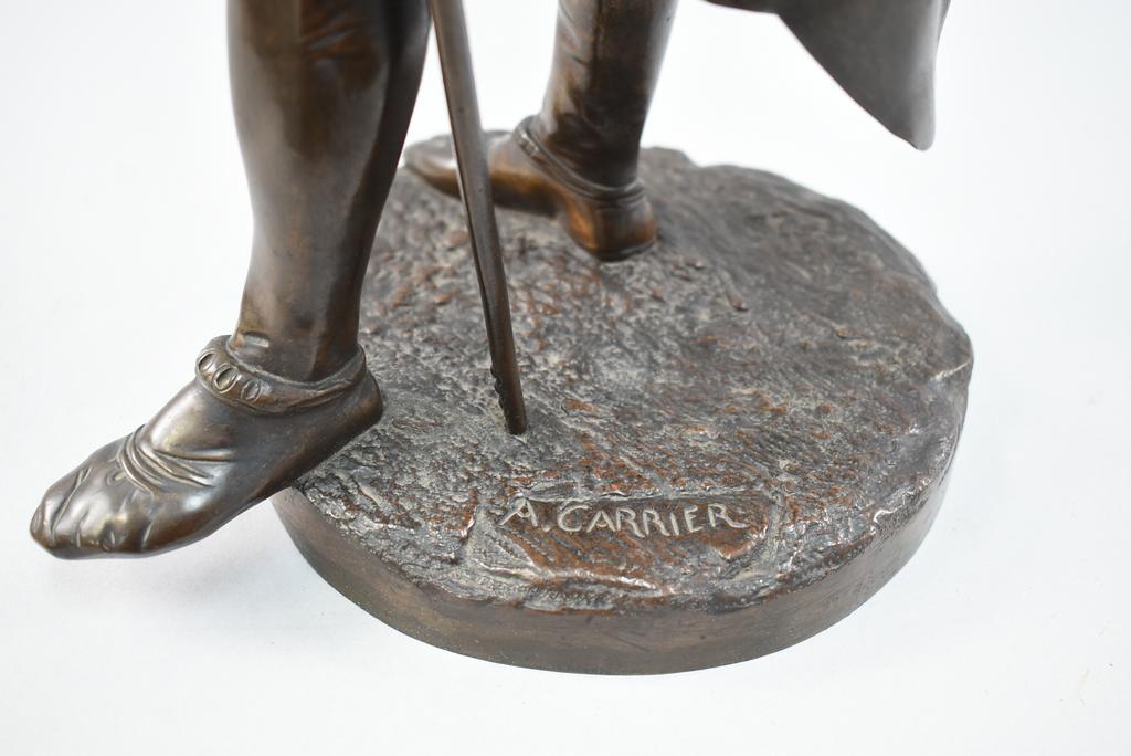 After Albert Ernest Carrier-Belleuse, Knight with Staff. With a smaller sword style weapon by his side. Marked A. Carrier. 18 1/4" tall.