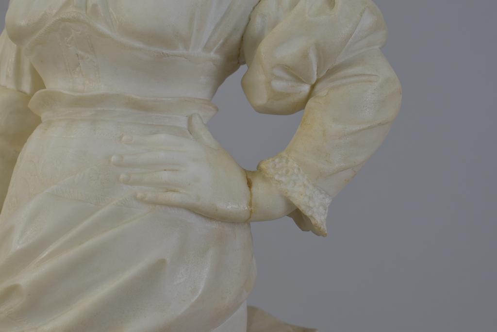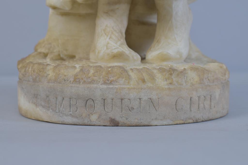 After Lapini, marble statue, Tambourine girl. Inscribed Lapini and Florence. Titled "Tambourin Girl". 24.5" H, 7.5" W, 8"D. (Repaired at left shoulder and wrist).