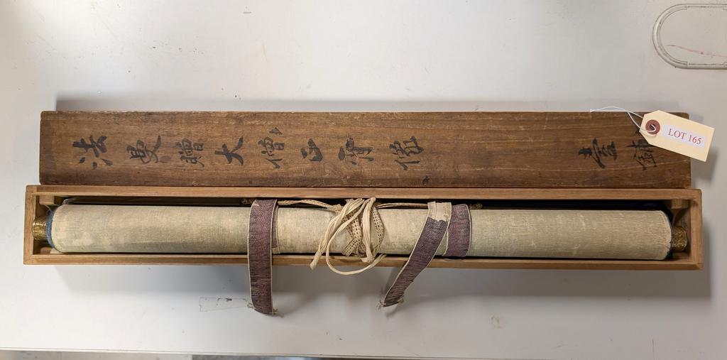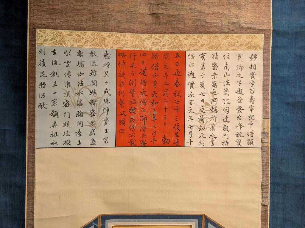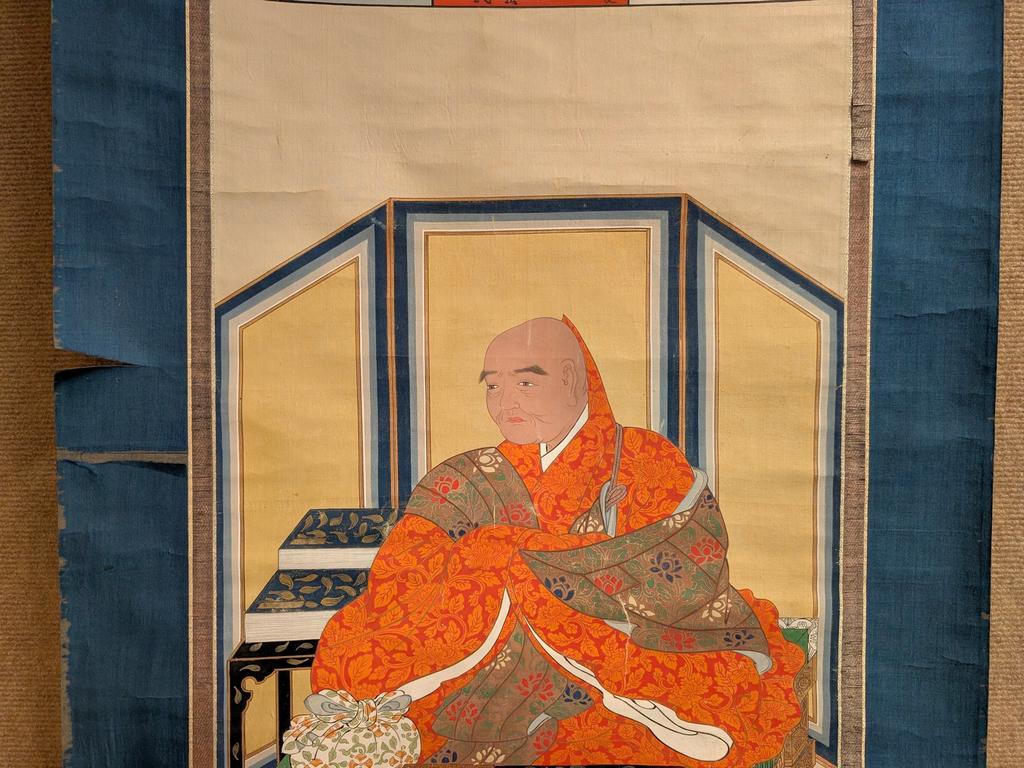 Antique Japanese Scroll. Painting On Silk Depicting A Seated Monk And With Calligraphy Panels Above. Image: 38.5" X 16.25".