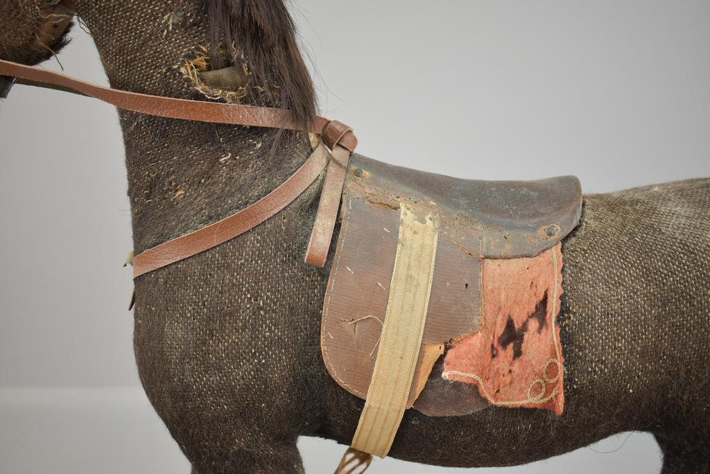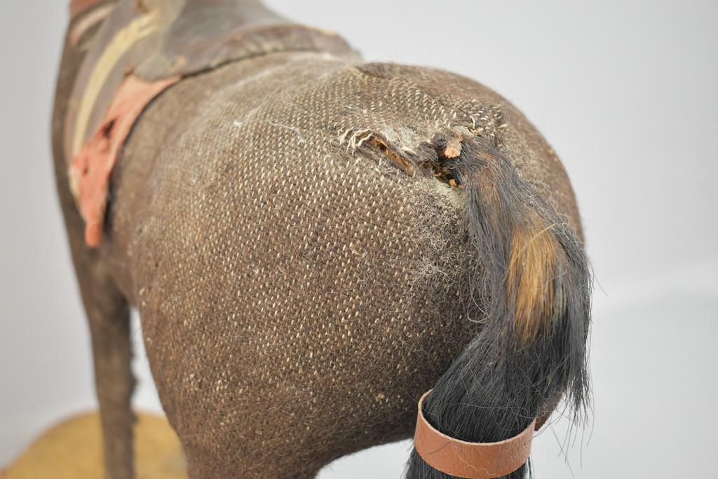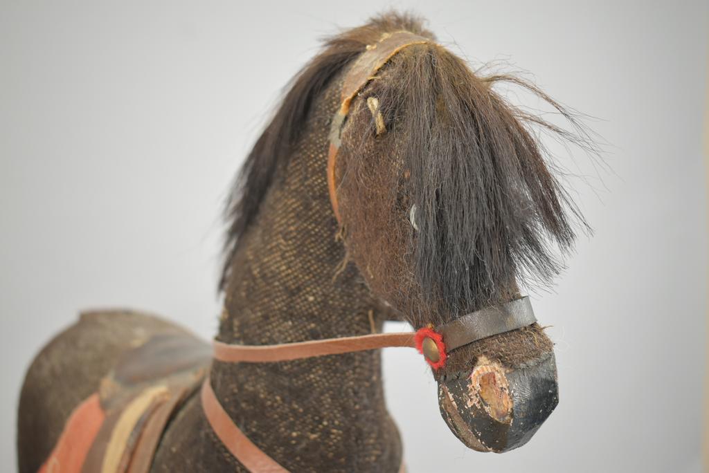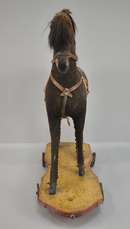 Antique mohair horse pull toy. On wooden board with 4 metal wheels. 24" W, 9" W, 25" H.