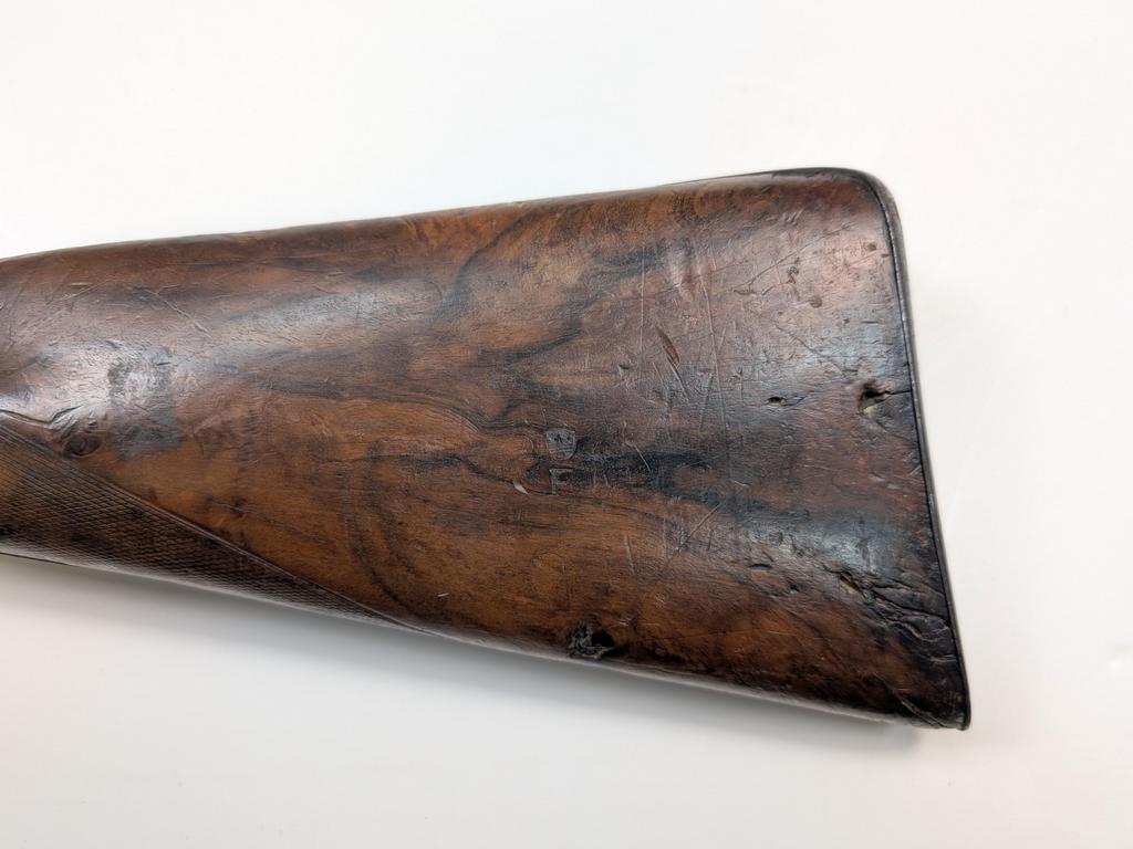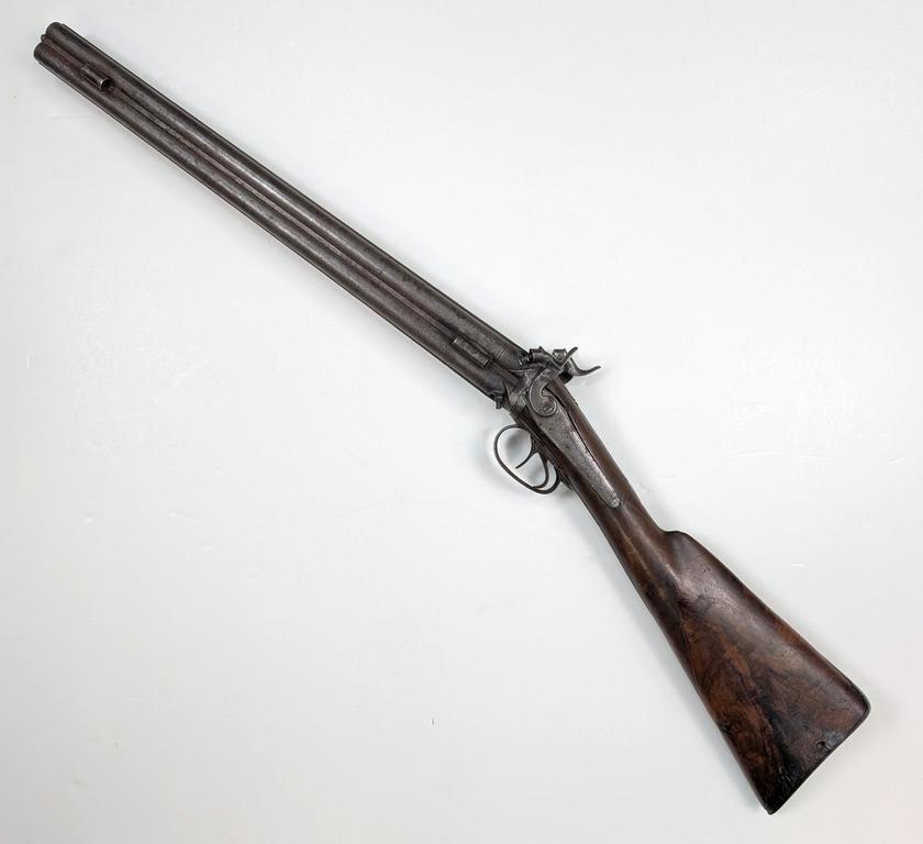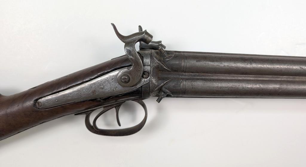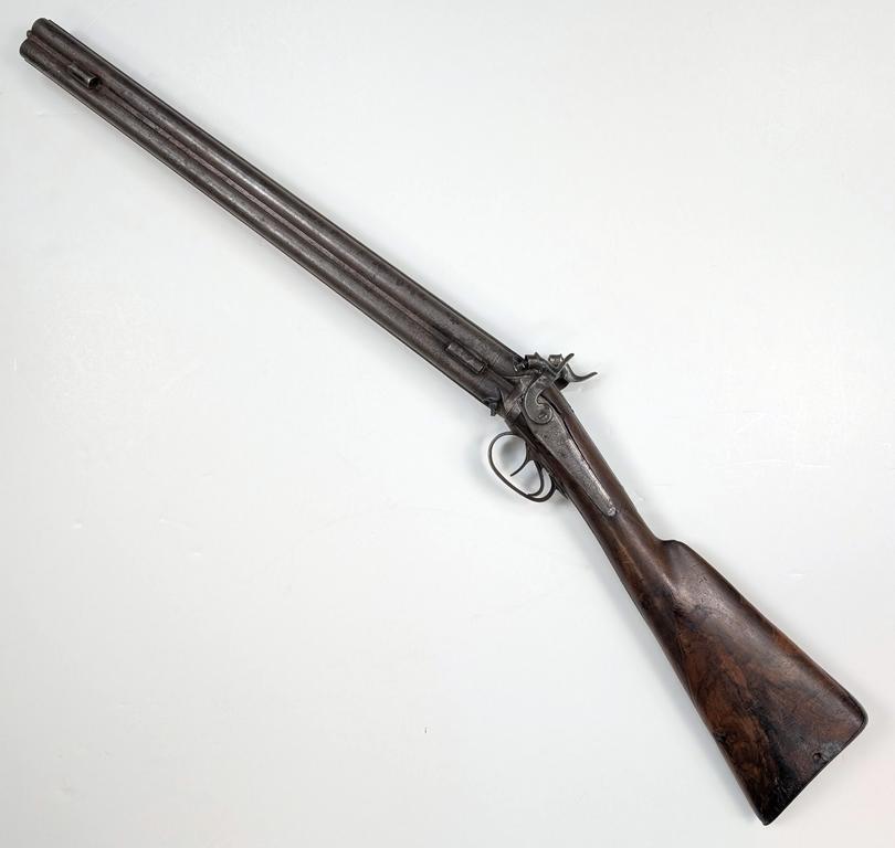 Antique Quad Barrel Swivel Breech Muzzleloading Shotgun. Watered steel barrels and connecting ribs with engraving near breach. Engraved lockplates and trigger guard. Walnut stock with steel butt plate. Dimensions: barrel 20 inches, overall 35.5 inches. Bore diameter 0.60 inches.