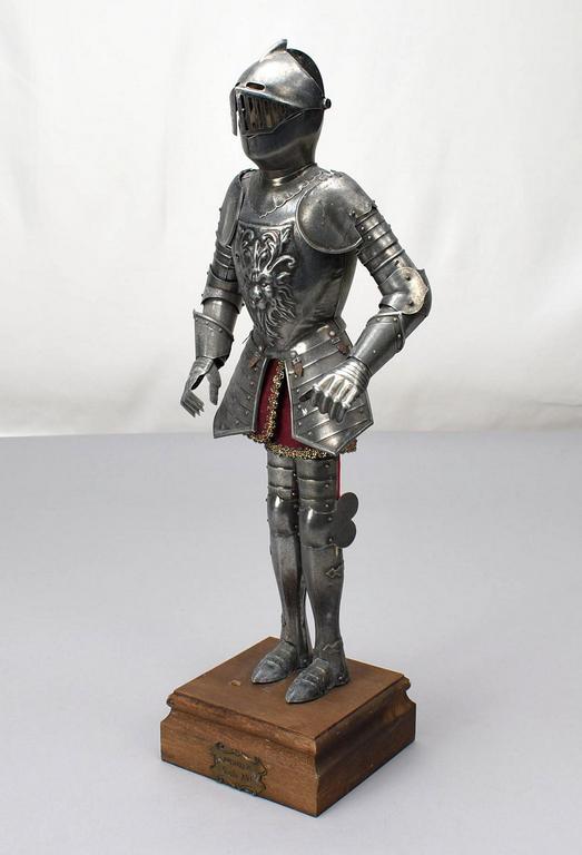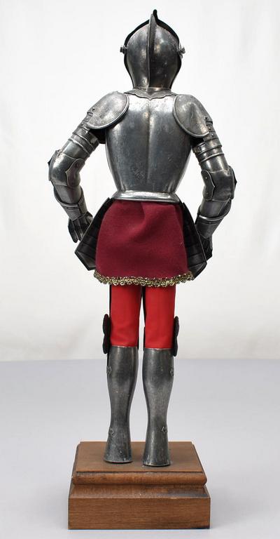 Armadura articulated metal figure of a 16th C. Knight. Composition head, wood plinth. Overall: 19.5" tall.