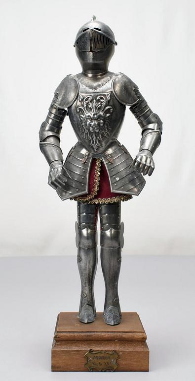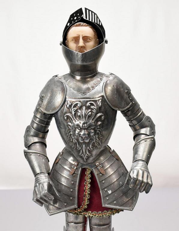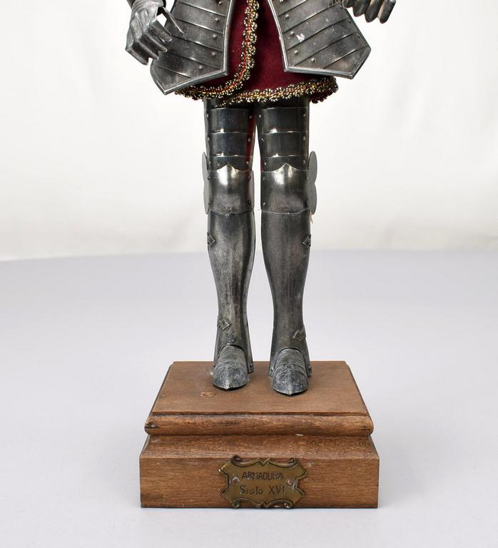 Armadura articulated metal figure of a 16th C. Knight. Composition head, wood plinth. Overall: 19.5" tall.