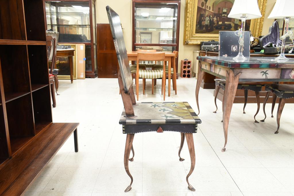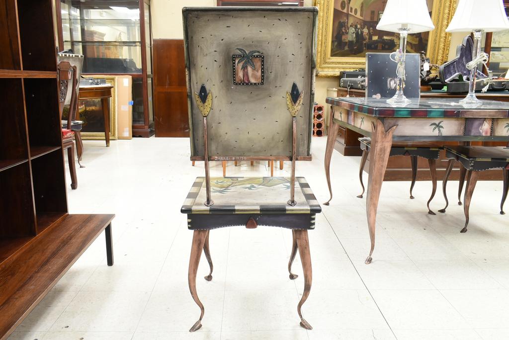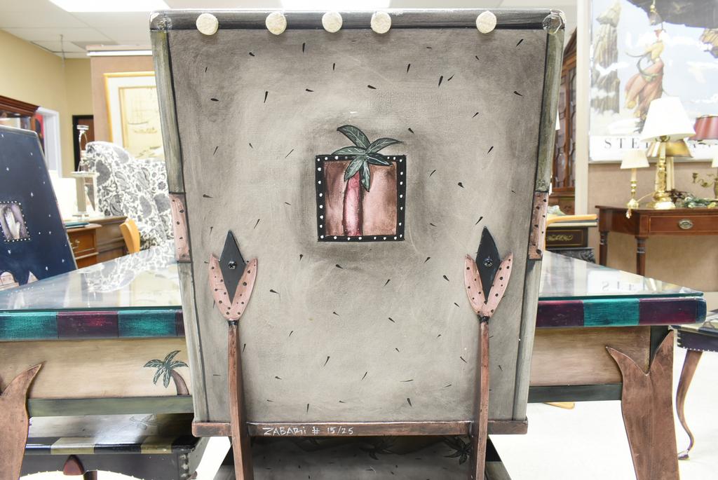 Avner Zabari designer table and 4 chairs. Painted wood top table with metal legs (marked Zabari #12/25) with set of 4 conforming chairs (marked Zabari #12/25, #13/25, #14/25, #15/25). Table top with reversible inset. With a custom glass top. Table: approx. 41" W, 41" D, 30" H. Chairs: 42.5" H.
