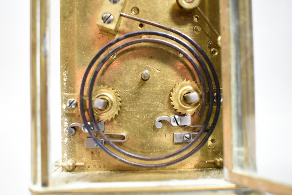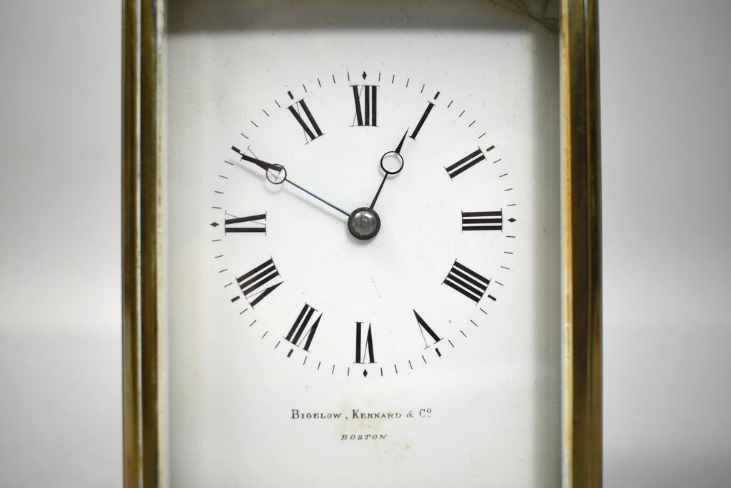 Bigelow, Kennard & Co. vintage carriage clock. Brass and glass case, enameled dial with Roman numeral indicators. Overall: 7 1/4" tall, 3 3/4" x 3 3/8".