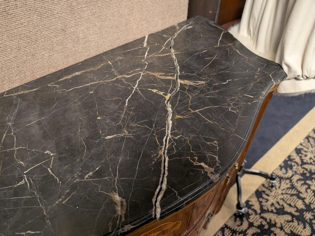 Black Marble Top 4-Drawer Bombe Style Chest With Marquetry Inlay.