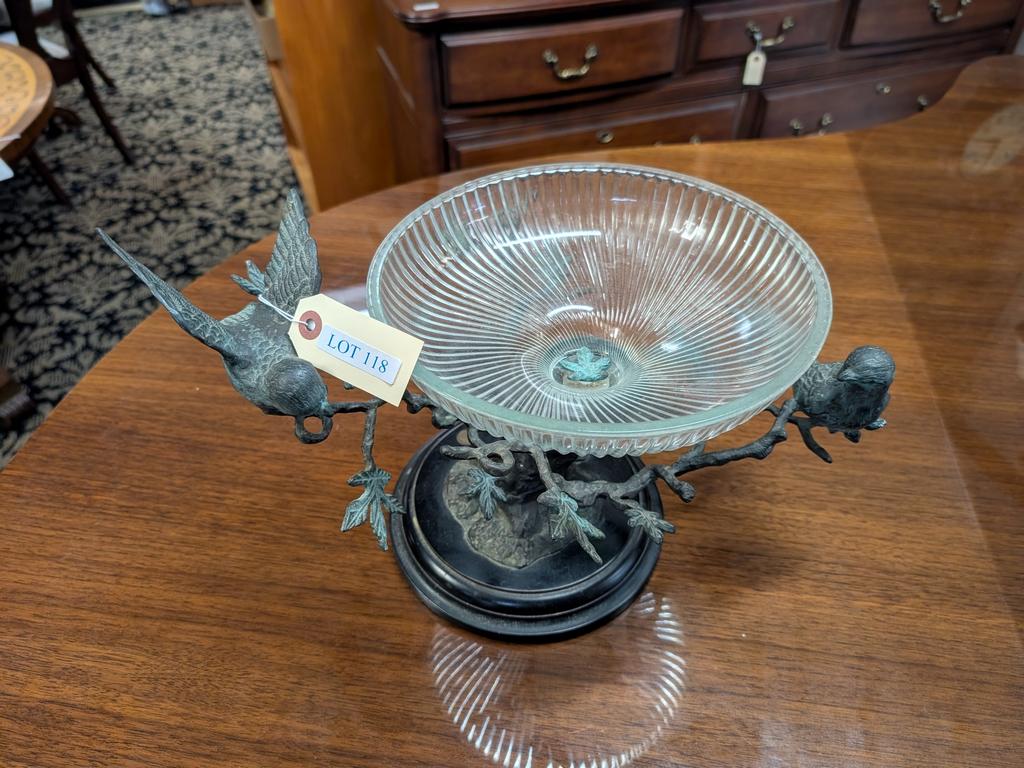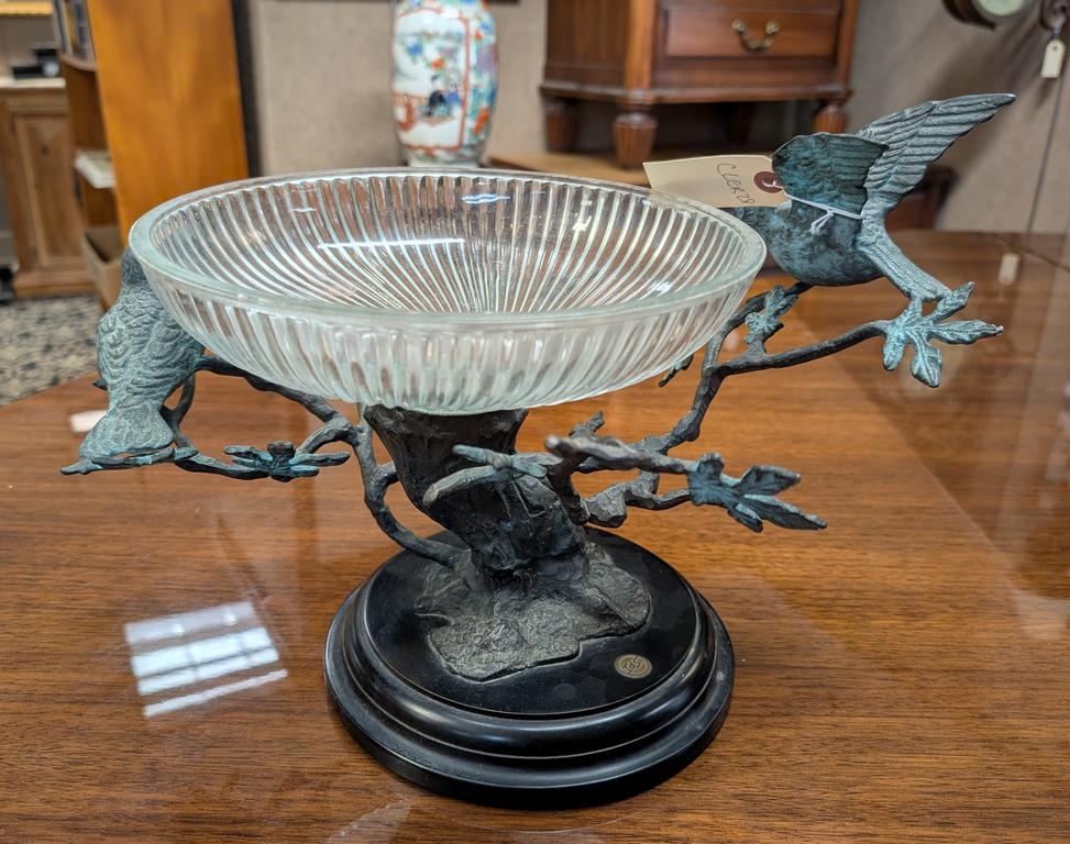 Bronze Bird And Branch Form Centerpiece Compote With Glass Bowl.