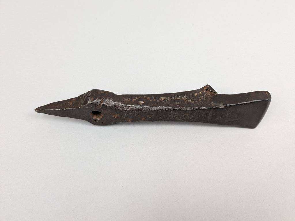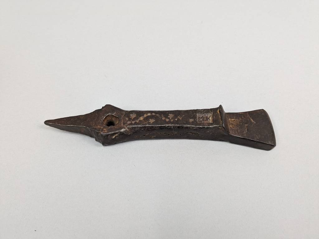 Bronze Crotal Bell and Denglestock Field Anvil. 18th C. Robert Wells spiked crotal bell Marked "24" and "RW" Overall length is 11.5 inches; 18th C. Forged steel denglestock scythe sharpening field anvil. Farrier mark MK and punch marked with rolling wave and stars on each side. Overall length is 8 inches.