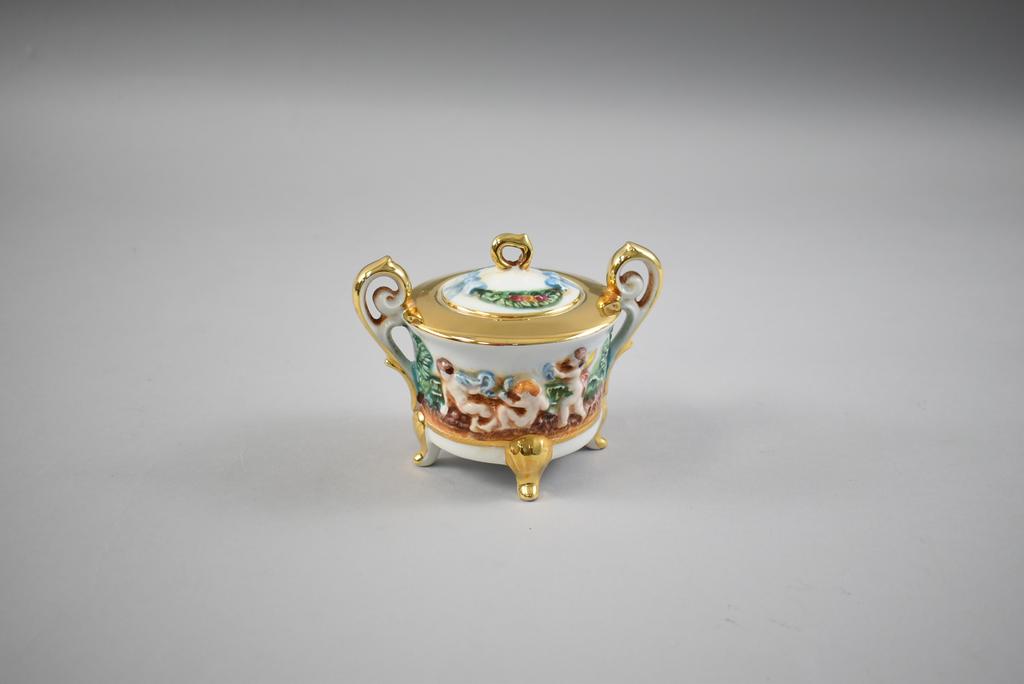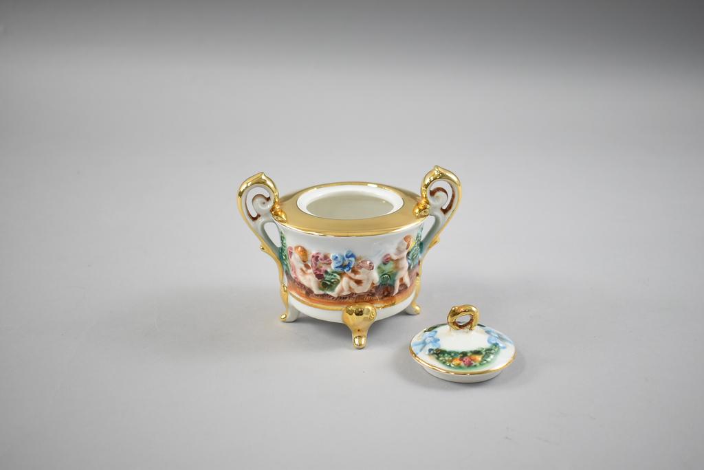 Capodimonte hand painted porcelain coffee and tea set. Embossed cherubs and gilt decoration. Cups with gilt wash interior. R. Capodimonte mark. Saucers with no mark. And an associated bell.