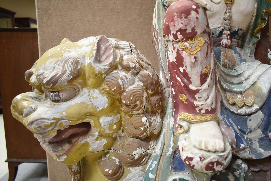 Carved wood and gesso polychrome figure of Bodhisattva Manjushri on a guardian lion. On a rectangular stand. Approx. 44" H, 36" W, 18" D.