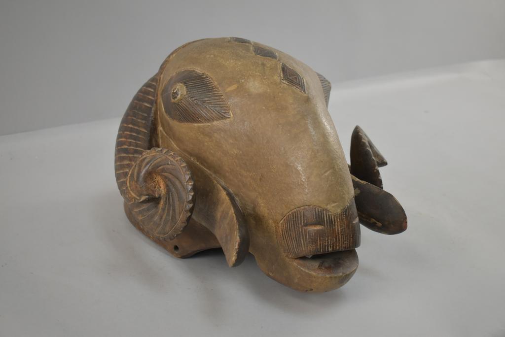 Carved Wood Ram's Head Mask.