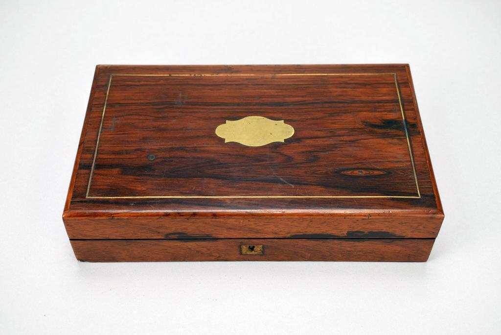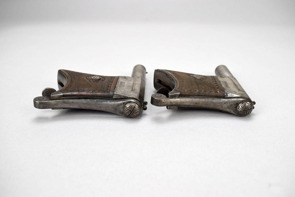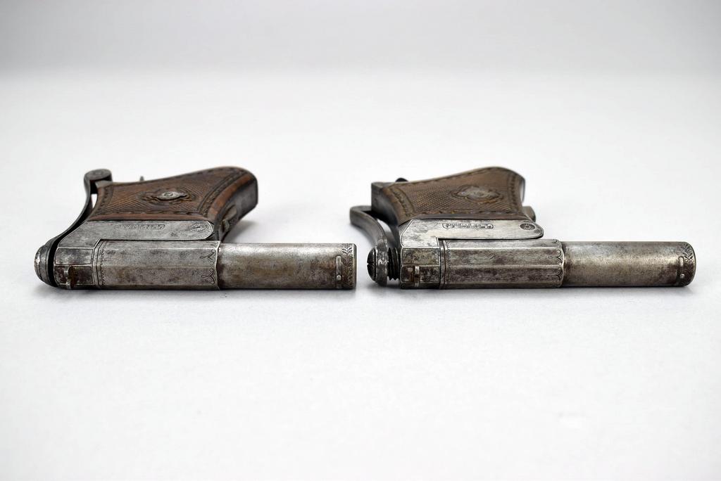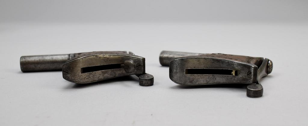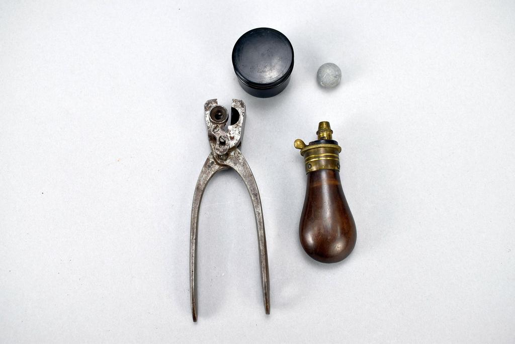 Chamelot Delvigne breech loading rotary lever, under hammer percussion cap pistol set with bullet mold and powder flask in presentation box.