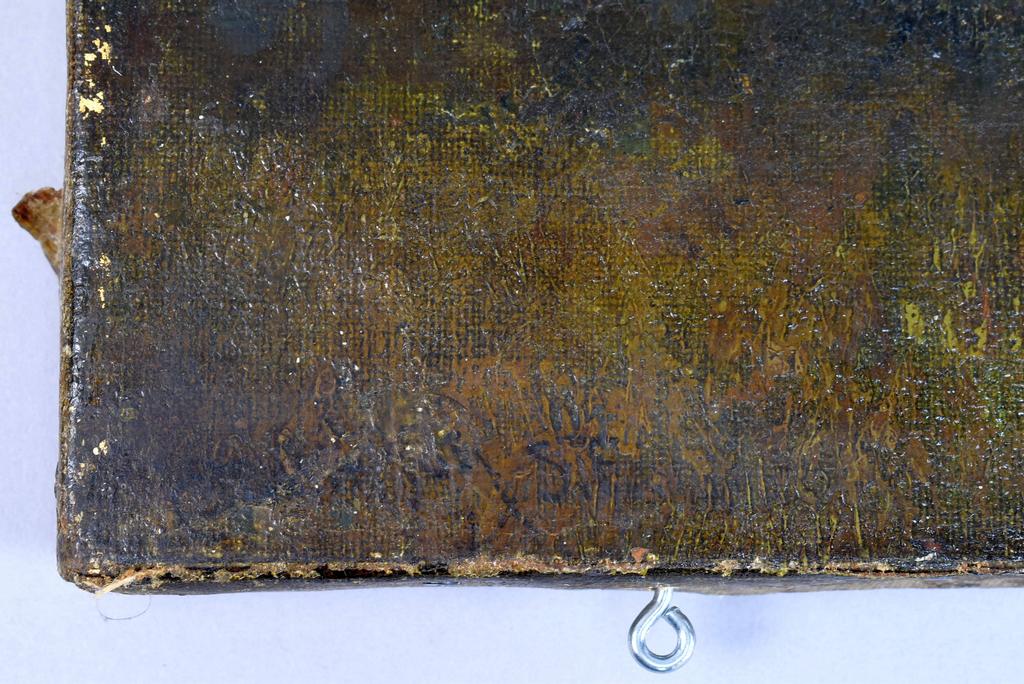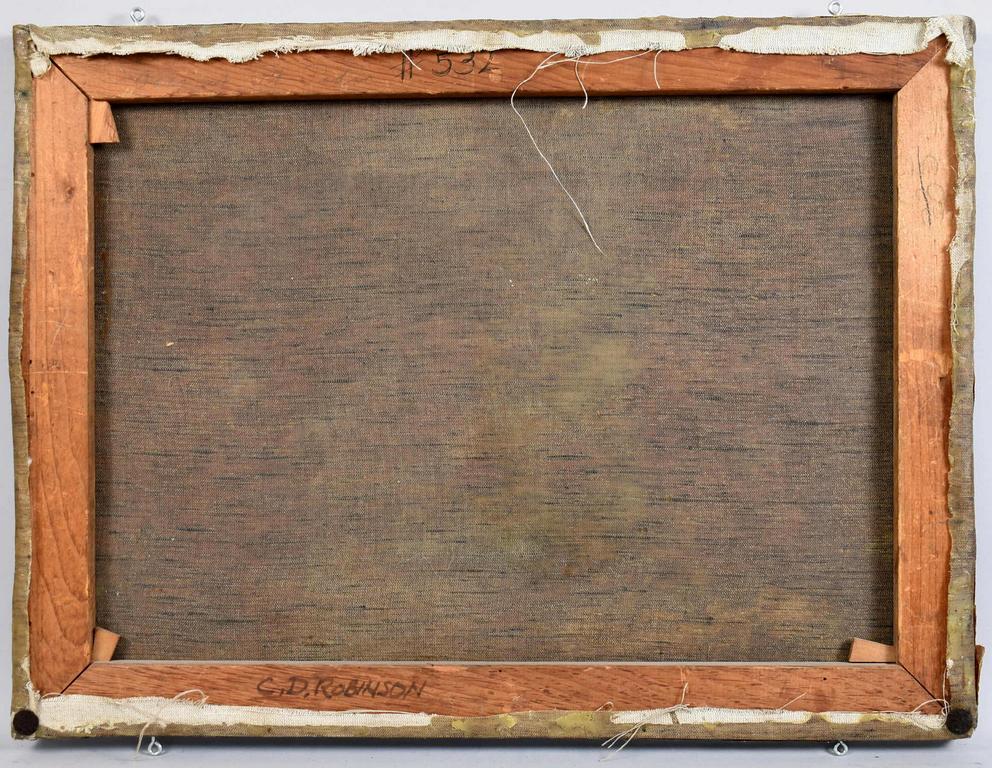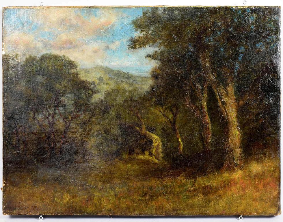 Charles Dormon Robinson (1847 - 1933), Oil on canvas, Woodland scene with mountain in the background. Faint indecipherable signature lower lift. Canvas stretcher marked C. D. Robinson. 18" x 24". Framed, overall: 24" x 30".