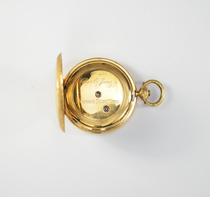 Charles Jacot 18K gold hunter case pocket watch. Enameled dial with Roman numerals, seconds dial with Arabic numerals. Marked State Stamp of Neuchatel for 18 Carat Gold. Works marked Chas. E. Jacot No. 5143. Personalized inscription dated 1866. 64.9 grams total.