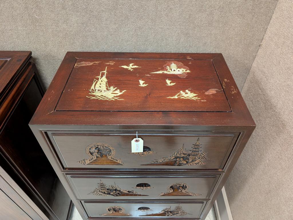 Chinese Carved 4-Drawer Chest. Pagoda, Landscape And Figural Inlay. 24" X 15" X 40".