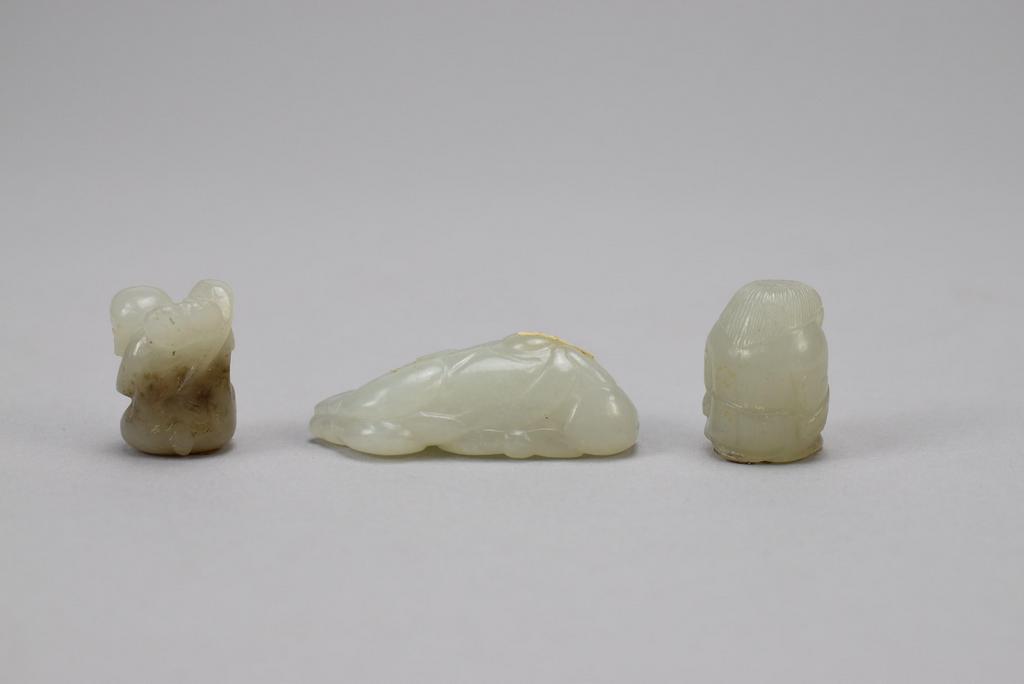 Chinese carved jade and 2 miniature toggles in the form of seated monkey and man with folded arms. 2", 1" & 1" tall.