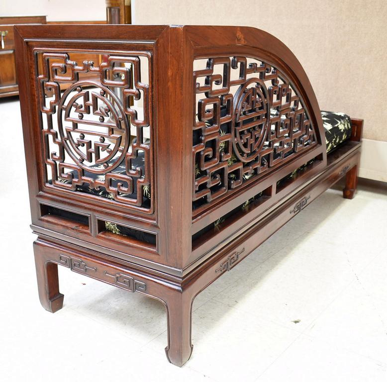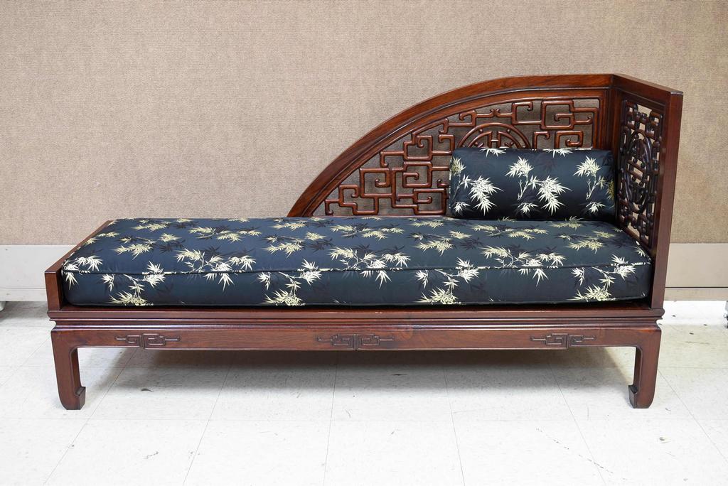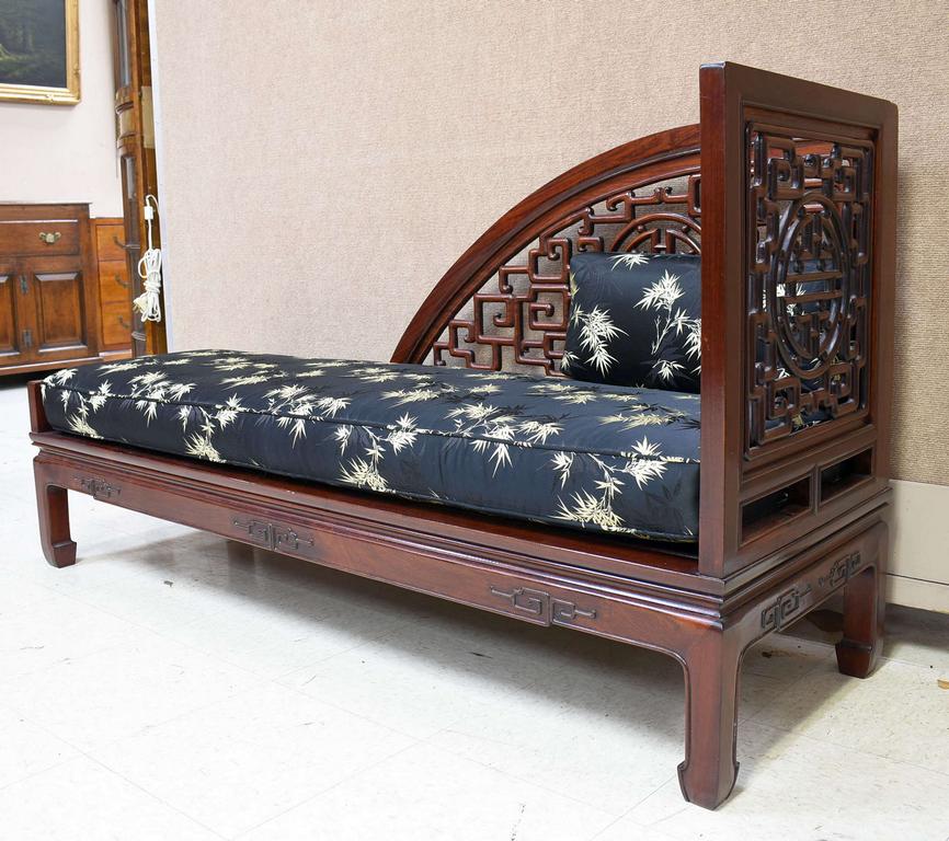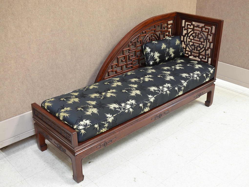 Chinese carved rosewood lounge chair. Plank seat with silk upholstered cushion. 60" W, 19.5" D, 31.5" H.