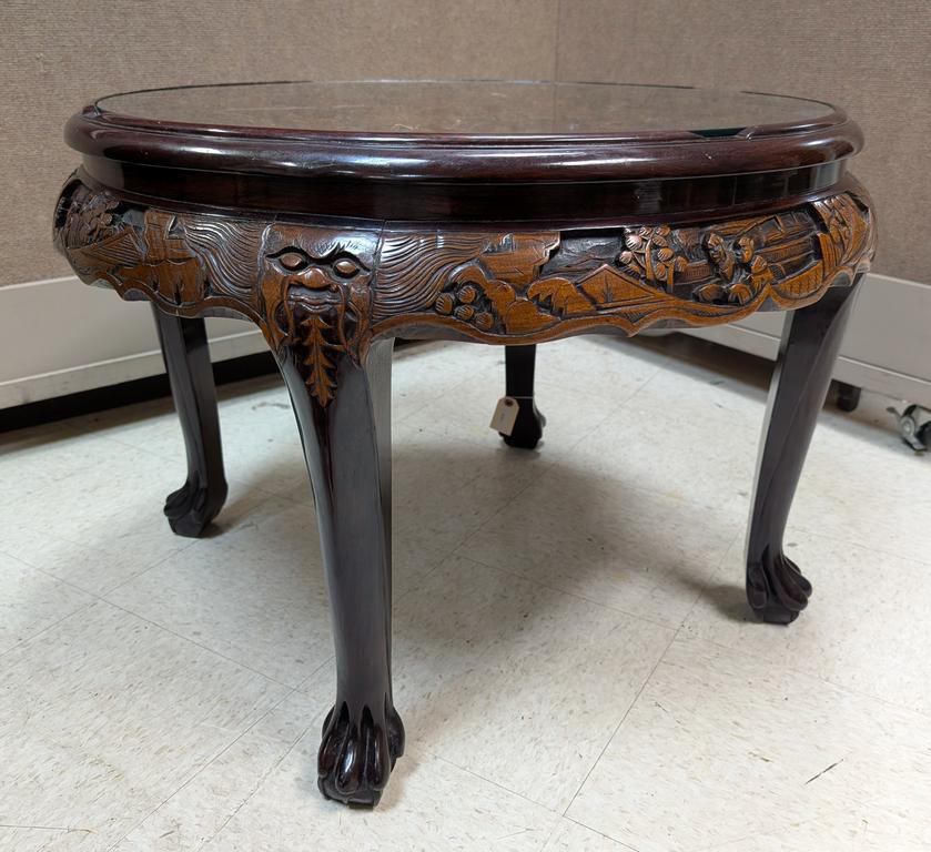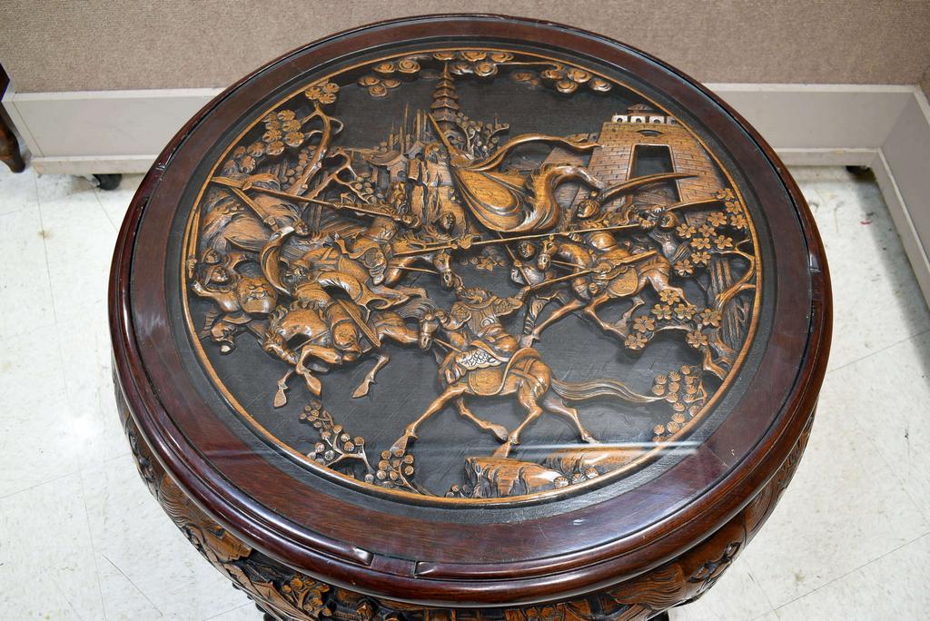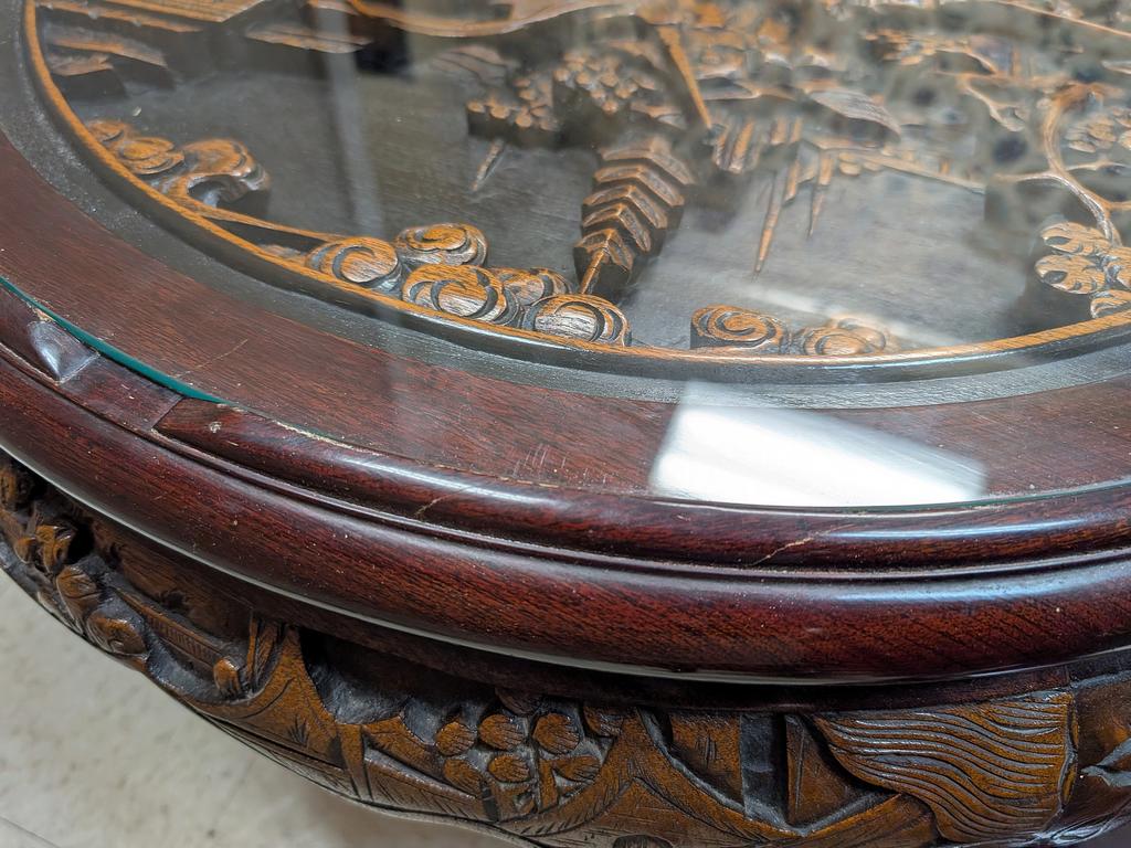 Chinese carved wood & glass top chow table with 4 stools. Ornate carved battle scene. Table: 32" W, 22" H.