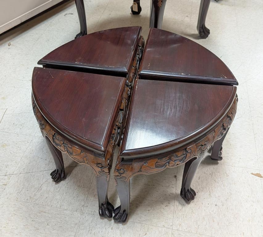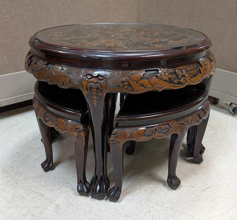 Lot 22: Chinese Carved Wood Chow Tables & 4 Stools.