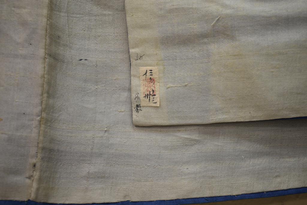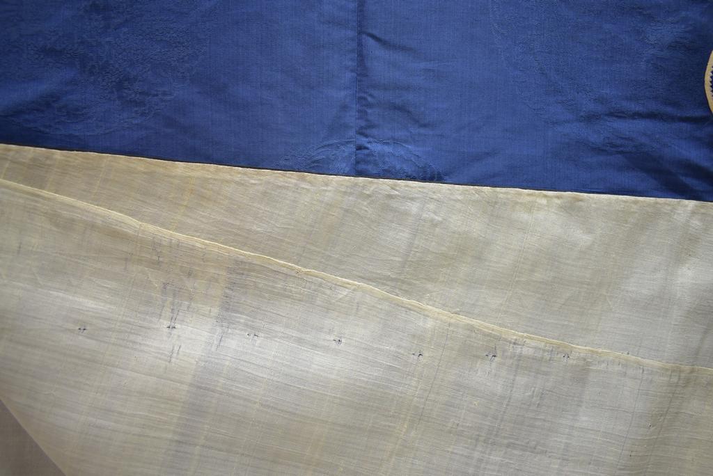Chinese embroidered silk robe. Blue with circular patterns, black edges with bird and floral design, off-white sleeves with floral design. 54" long, 51" wide. With wood wall hanging support.