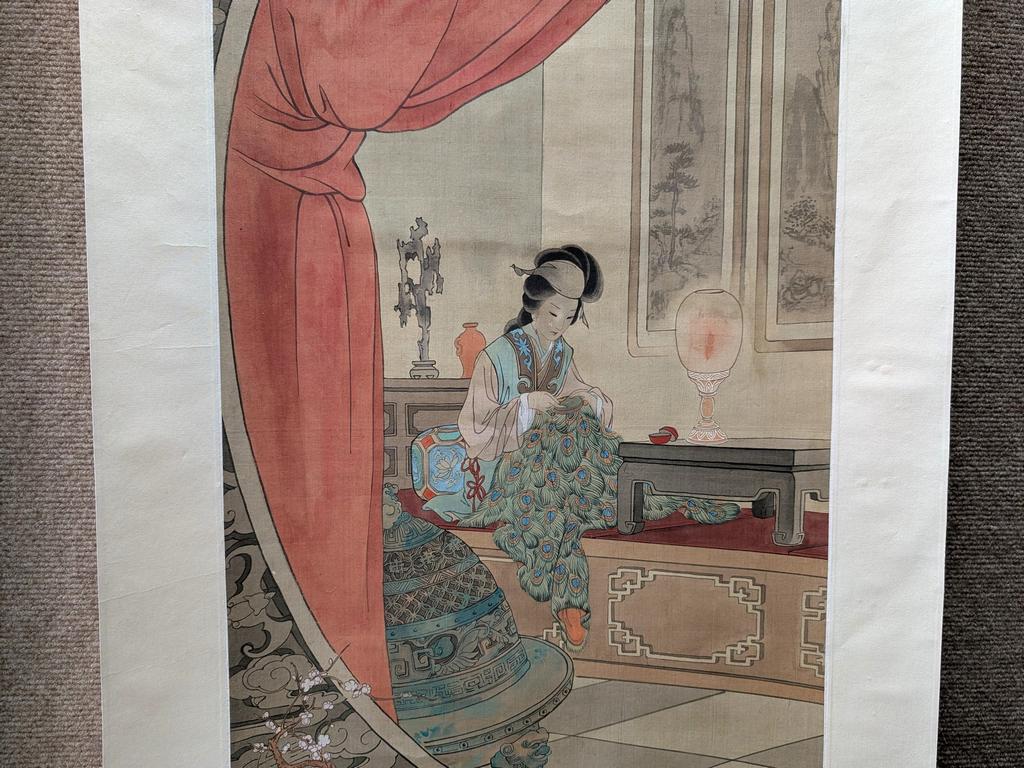 Chinese Painting On Silk, Seated Woman Embroidering.