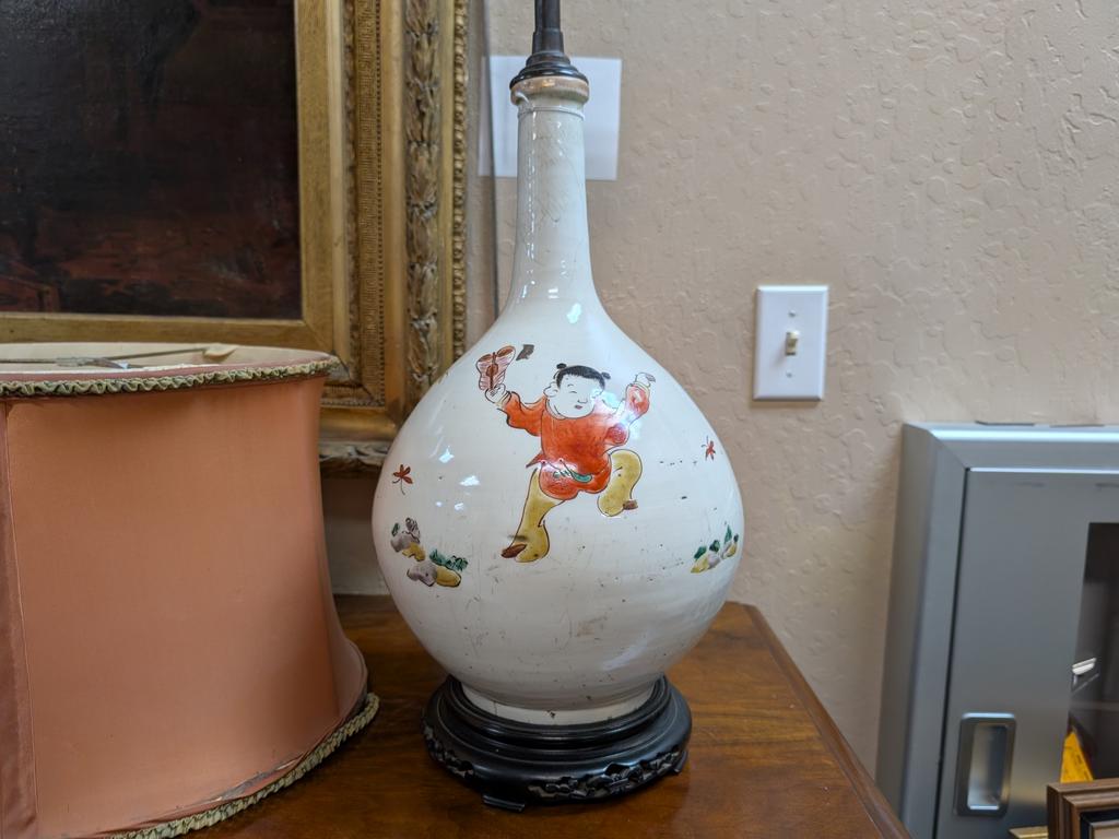 Chinese Polychrome Porcelain Table Lamp (Children Playing) With Silk Shade. O/A: 27" Tall.