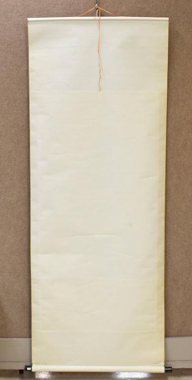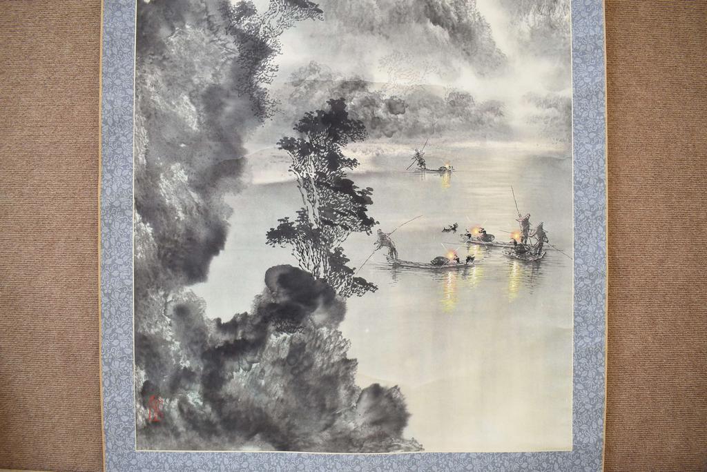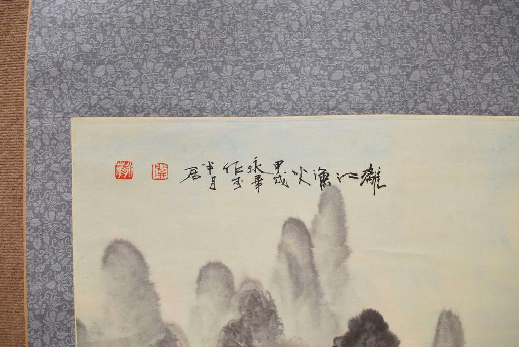 Chinese watercolor on paper, Mountain lake landscape with fisherman in boats. Inscribed, with seals. 52.5" x 26". With silk background.
