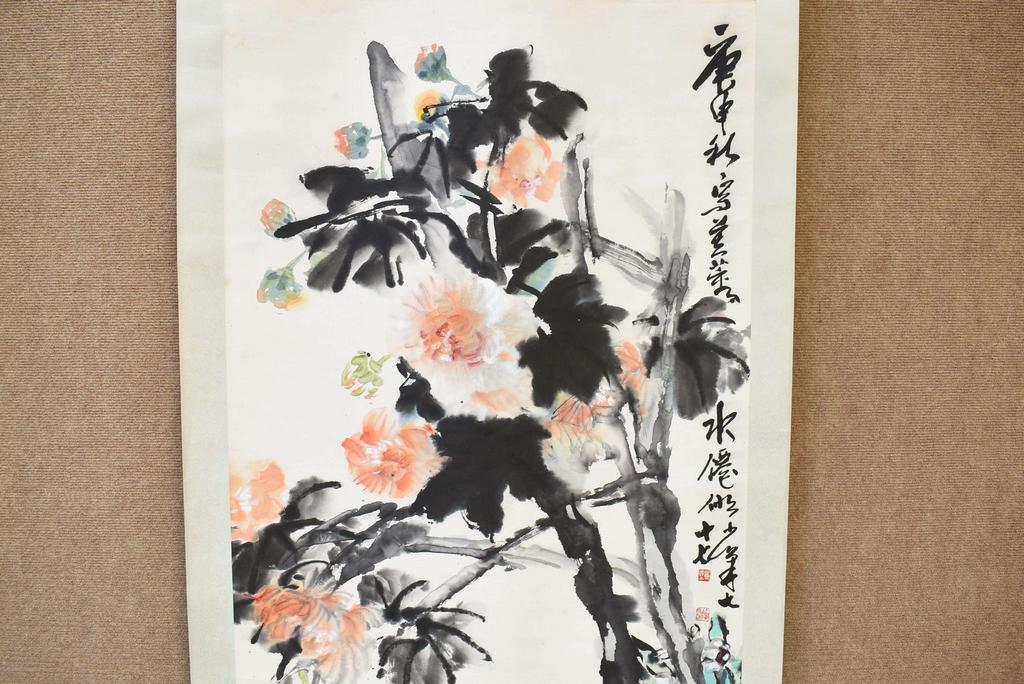 Chinese Watercolor On Paper, Tree with Flowering Branches. Inscribed, with Seals. 48.5" X 24". with Silk Backing.